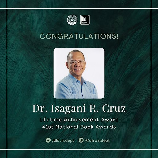 The DLSU Department of Literature congratulates Professor Emeritus, University Fellow, and former Chair of the Department of Literature, Dr. Isagani R. Cruz, on receiving the Lifetime Achievement Award at the 41st National Book Awards!