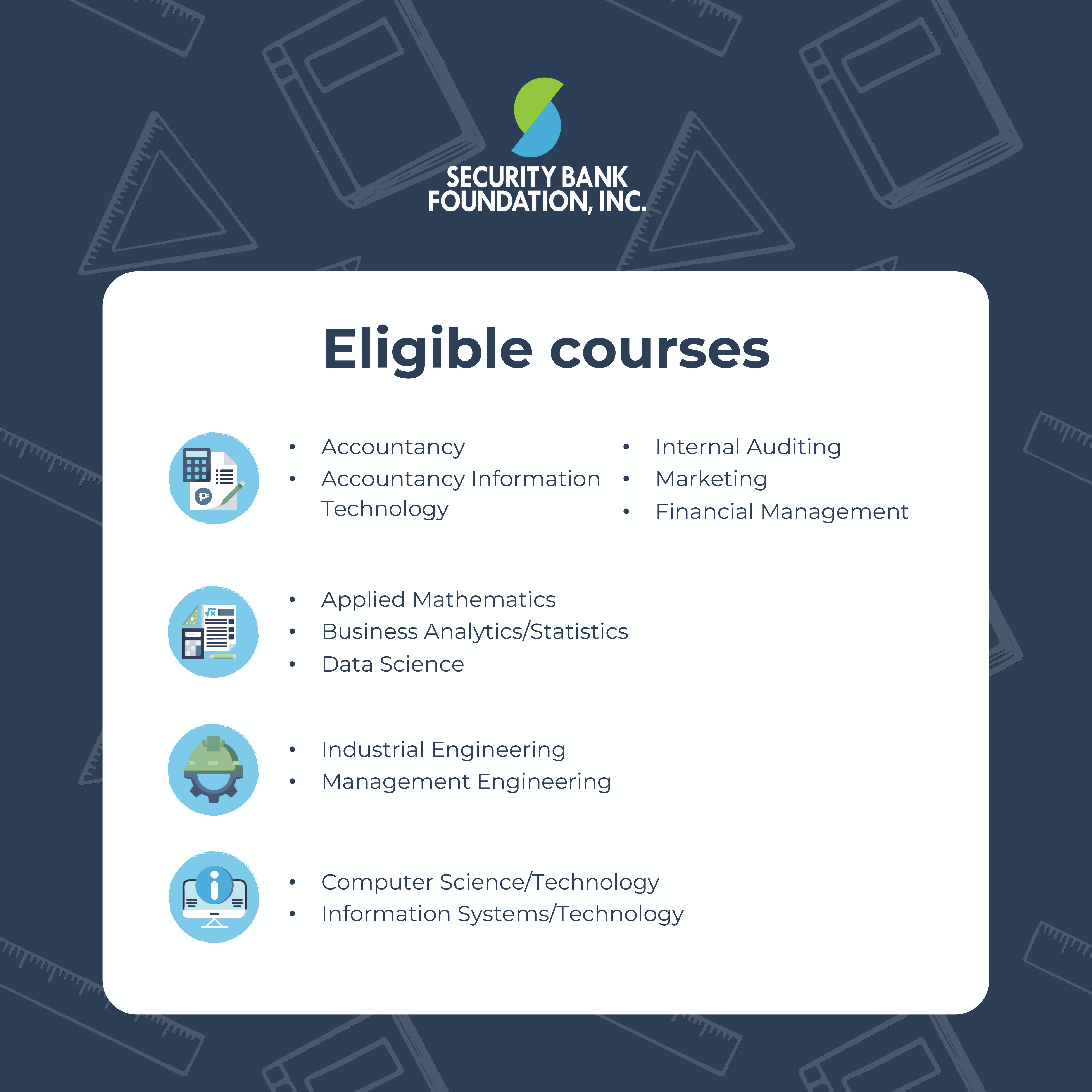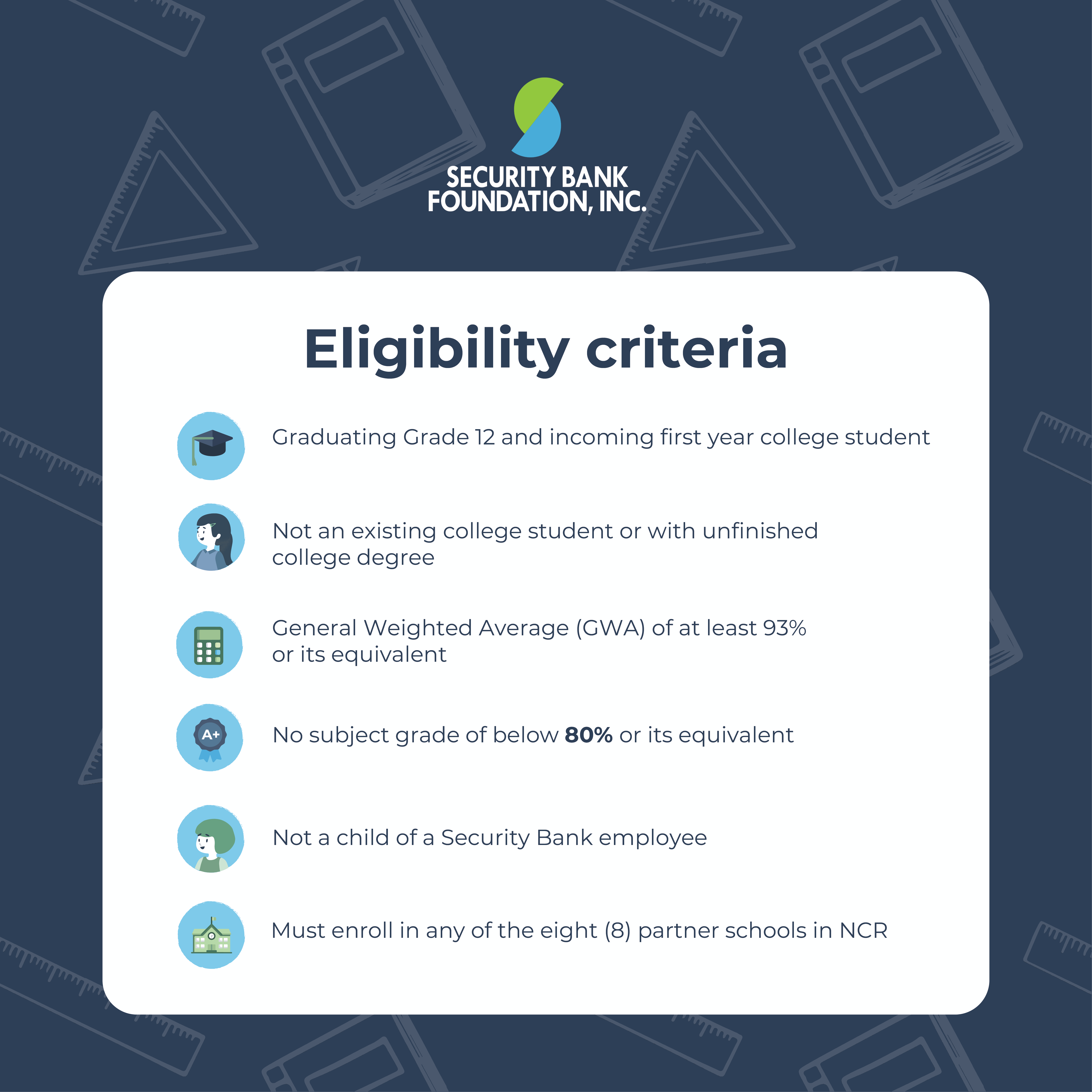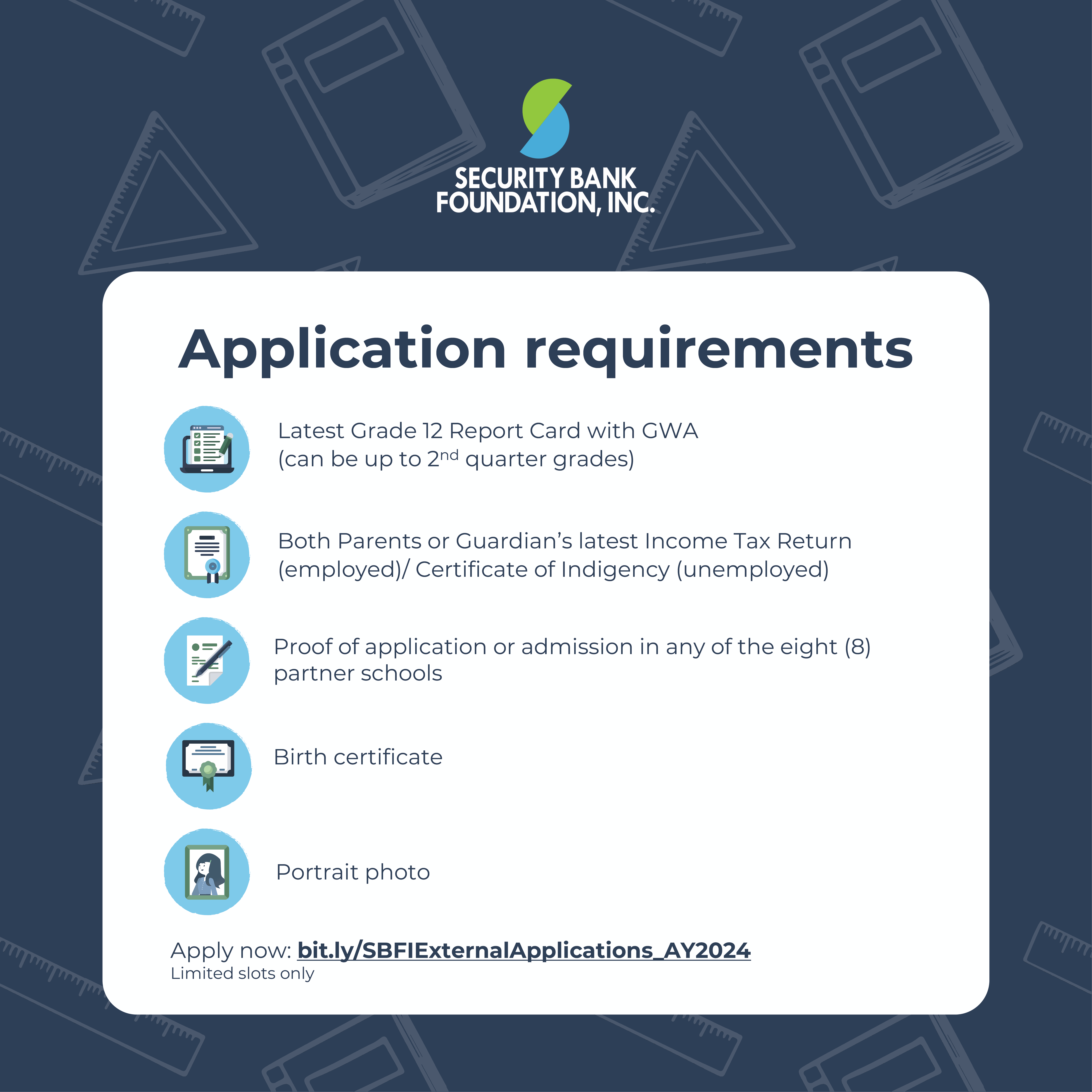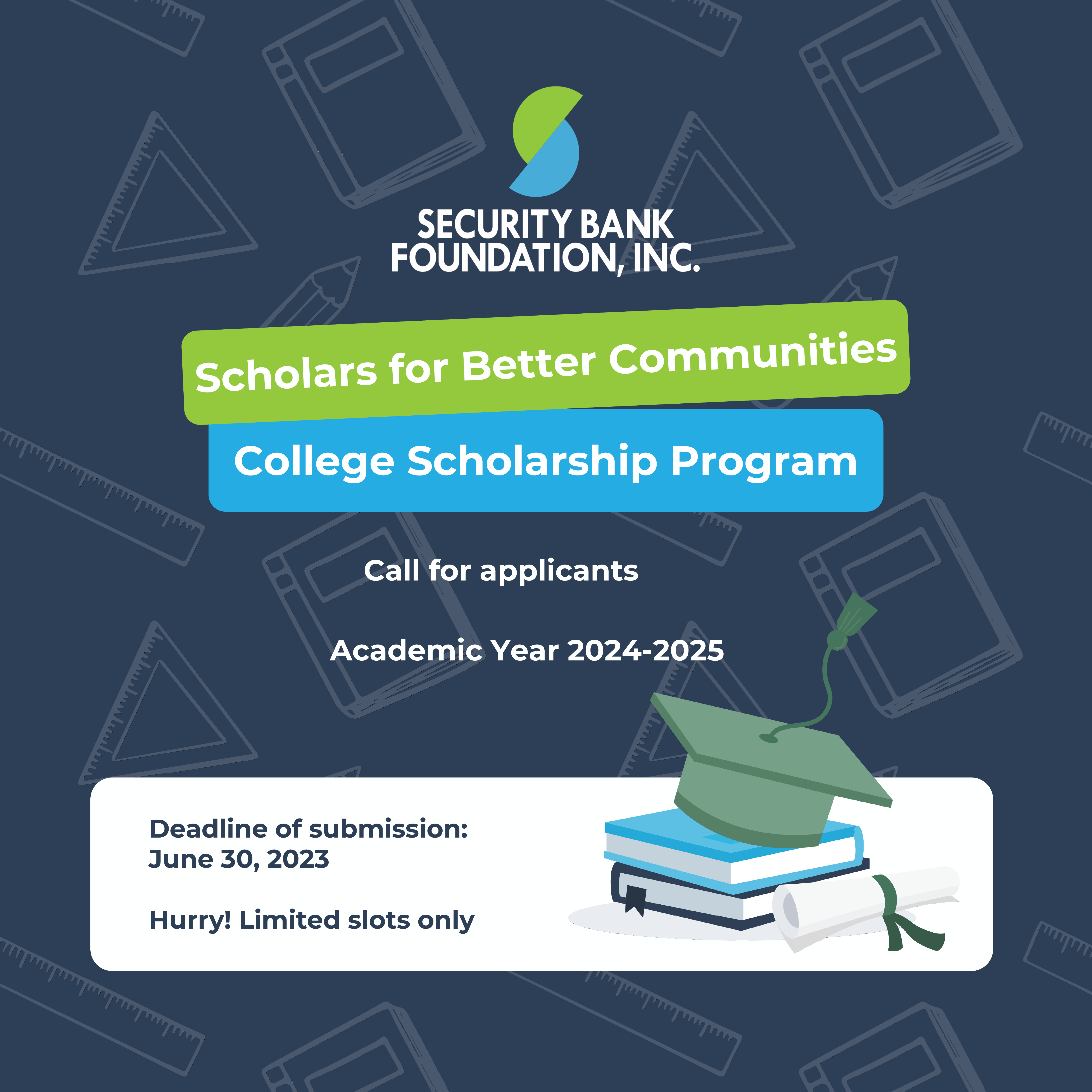 Security Bank Foundation’s “Scholars for Better Communities: College Scholarship Program”, is now accepting applications for aspiring scholars for AY 2024-2025. APPLY for this Scholarship Deadline of applications: June 30, 2024 Click HERE for more details.