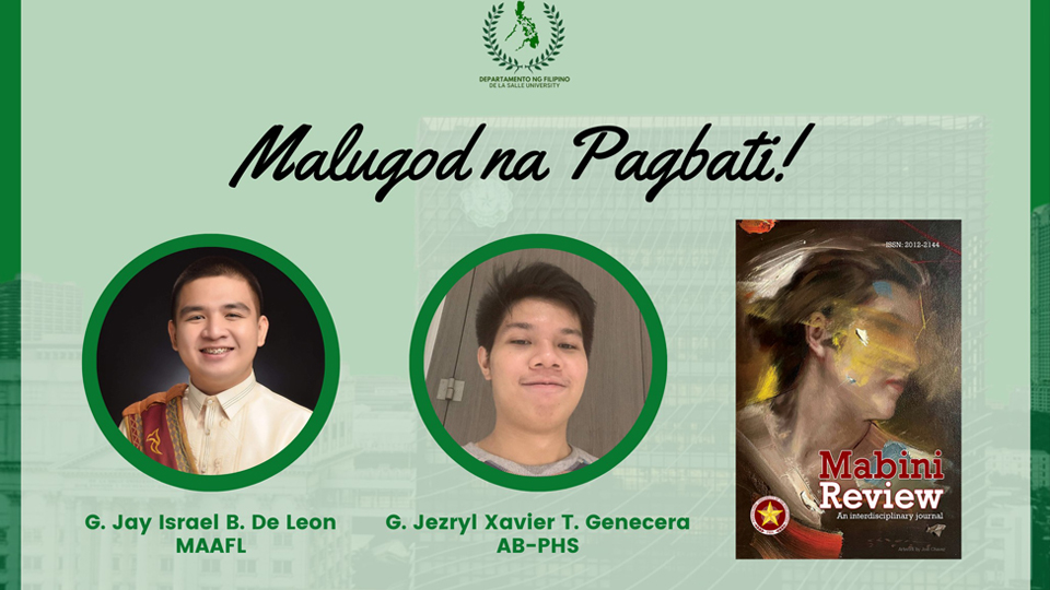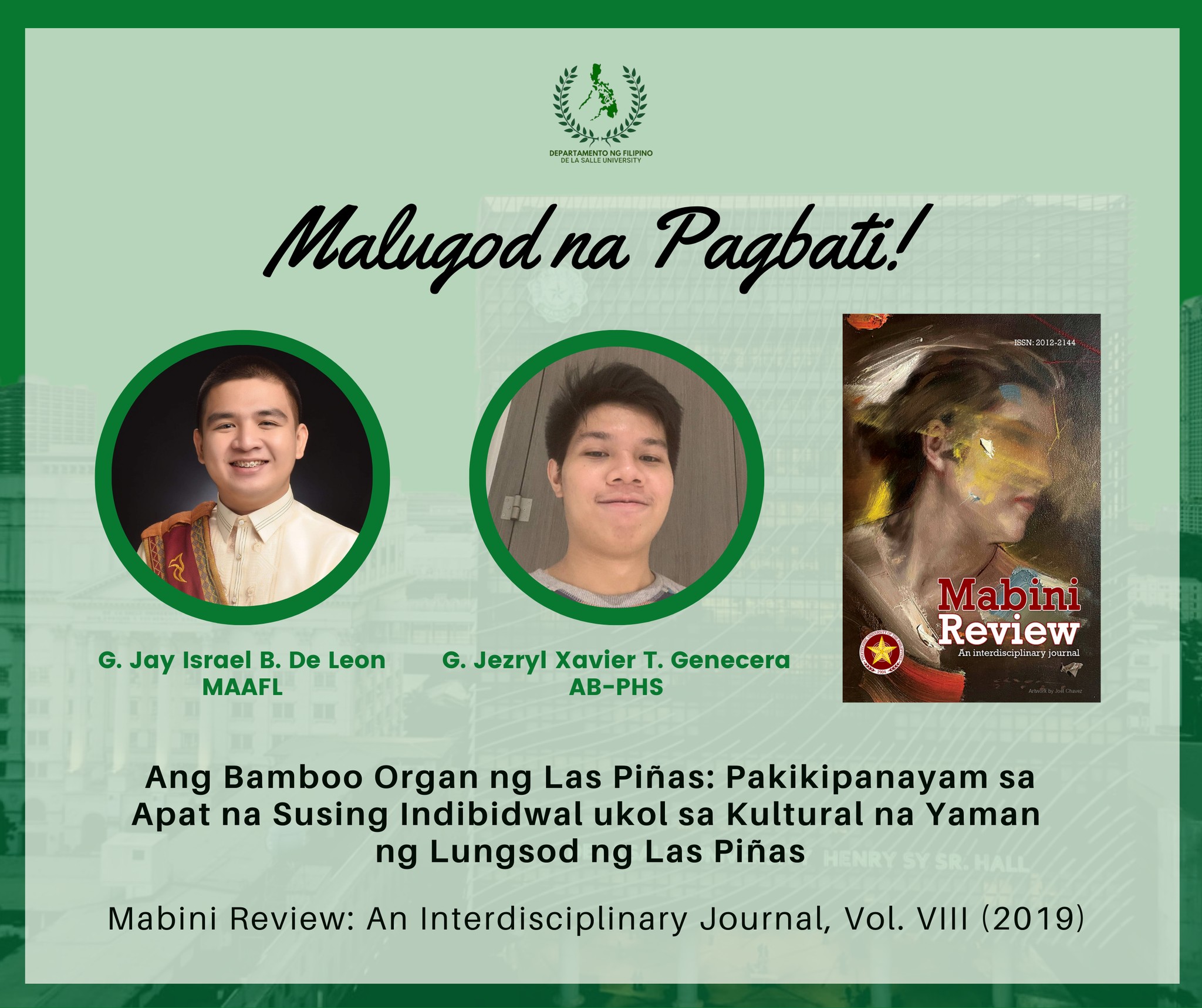 Malugod na pagbati kina G. Jay Israel B. De Leon at G. Jezryl Xavier T. Genecera para sa pagkakalathala ng kanilang pananaliksik na “Ang Bamboo Organ ng Las Piñas: Pakikipanayam sa Apat na Susing Indibidwal ukol sa Kultural na Yaman ng Lungsod ng Las Piñas,” sa Mabini Review: An Interdisciplinary Journal, Vol. VIII (2019).