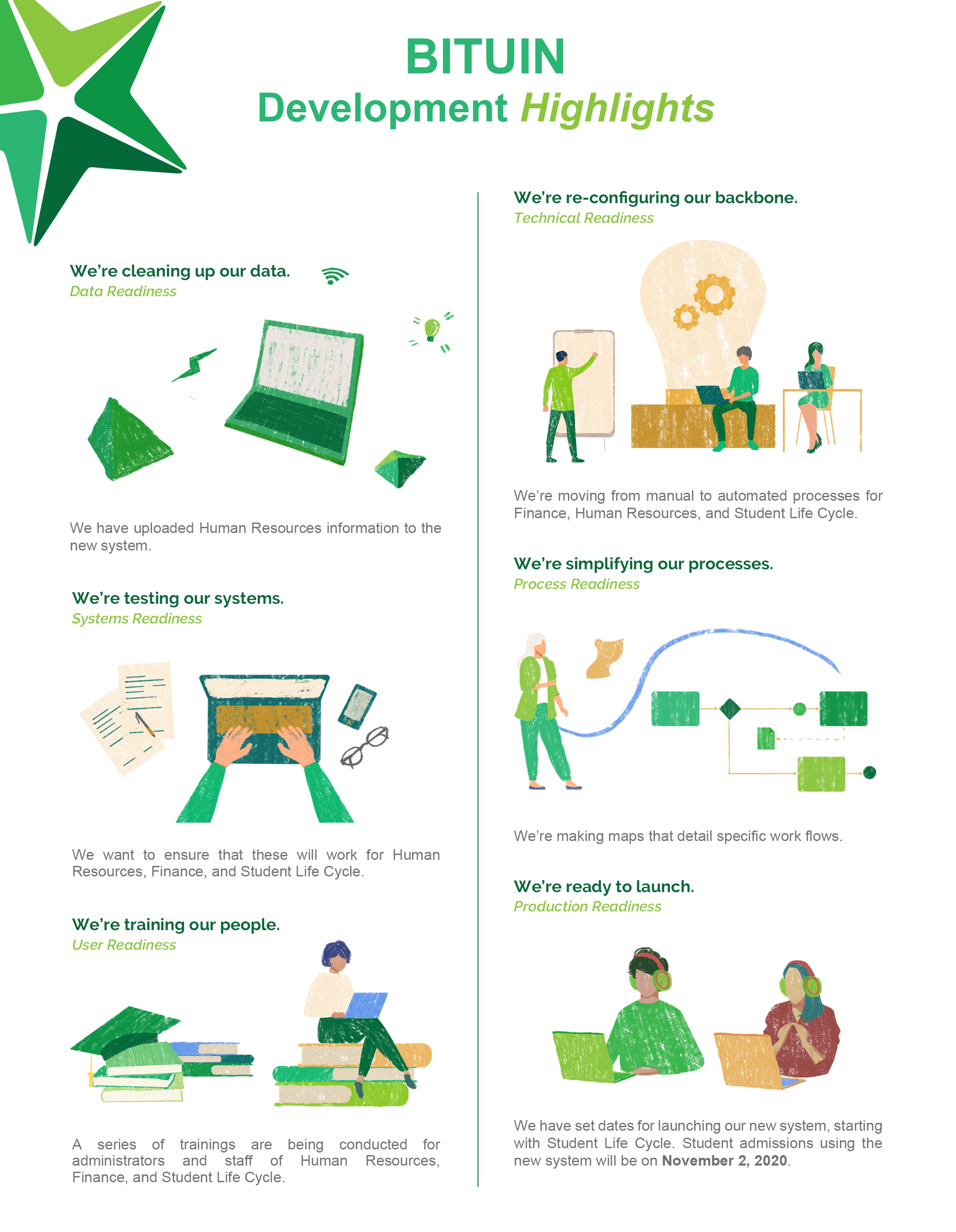 Focusing on the areas of financial management, student life cycle, and human resource, the Bituin Project team undertook development activities related to data, technical, systems, user, and production readiness.
