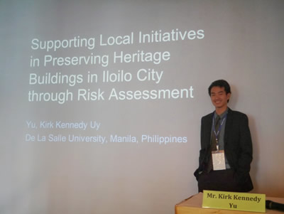 On the other hand, Mr. Kirk Kennedy Yu, BSMS CE student, presented the paper co-authored with Dr. Andres Oreta (DLSU), Noel Hechanova (CENRO) and Dr. Rhodella Ibabao (UPV) entitled “Supporting Local Initiatives in Preserving Heritage Buildings in Iloilo City (Philippines) through Risk Assessment.” The presentation elaborated on the legislative and actual efforts of the city government in preserving heritage buildings. It also discussed the vulnerable condition of the heritage buildings and the proposed implementation of a Rapid Visual Screening method to assess various risks and hazards.