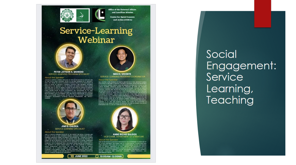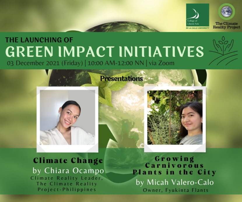 We commend the College of Liberal Arts’ launching of its Green Impact Initiatives program, a passionate response to DLSU Environmental Sustainability Policy and the 17 UN Sustainable Development Goals (SDG, 2015). We pray that this modest program, which aims to integrate environmental consciousness and climate actions into both curricular and extra-curricular activities, will transform our Lasallian learners into critical masses and innovative forces that work together with us towards the re-creation of a green and sustainable future.