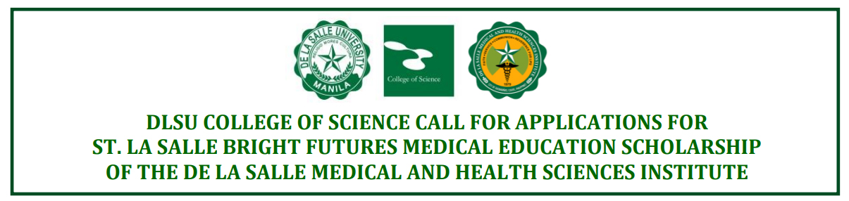 The De La Salle Medical and Health Sciences Institute (DLSMHSI) in Dasmariñas City, Cavite will award two scholarships under the St. La Salle Bright Futures Medical Education Scholarship (formerly Dean Recommended Academic scholarships in the Doctor of Medicine Program) to qualified applicants recommended by the DLSU College of Science Dean. The scholarship covers 100% of the total fees including miscellaneous and other fees. Recipients shall continue to enjoy these benefits until completion of the degree, provided they pass the yearly performance academic review of the Collegiate Scholarship Committee of DLSMHSI.
