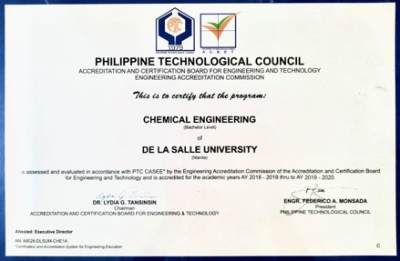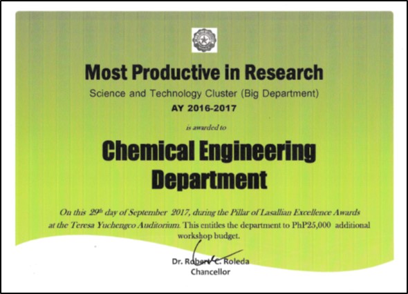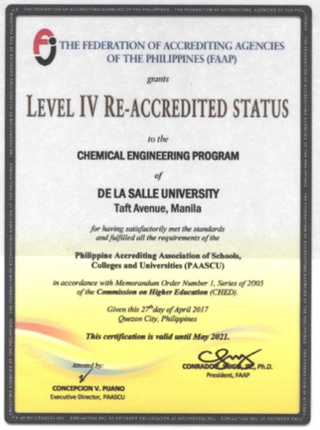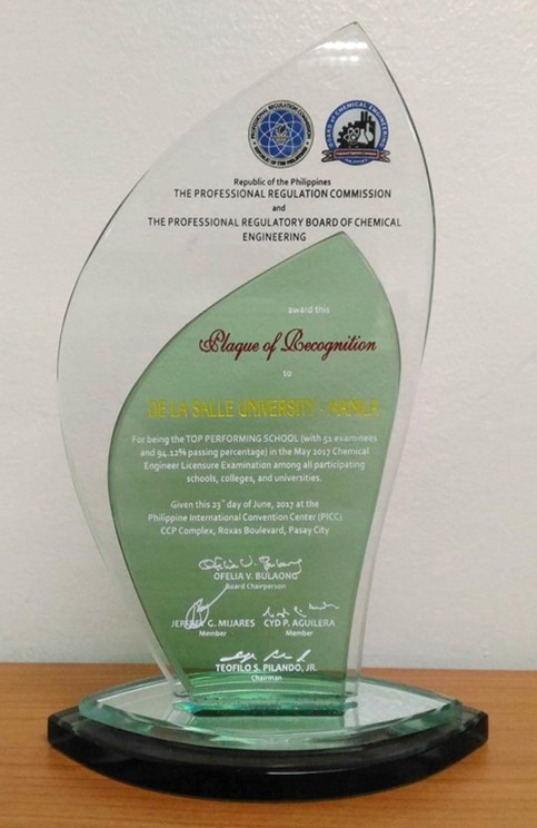 ![]() Top Performing School in the May 2017 ChE Licensure Examination DLSU Passing Rate of 94.12% National Passing Rate of 55.26% |