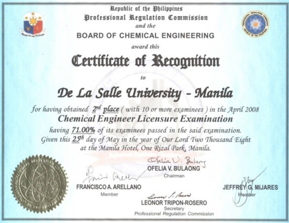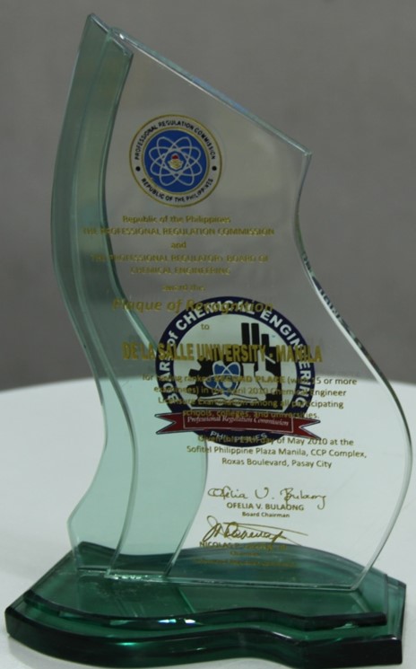 ![]() 3rd Top Performing School in the Nov 2009 ChE Licensure Examination DLSU Passing Rate of 83.33% National Passing Rate of 52.94% |