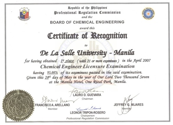 ![]() Top Performing School in the Apr 2007 ChE Licensure Examination DLSU Passing Rate: 95.24% National Passing Rate: 46.45% |