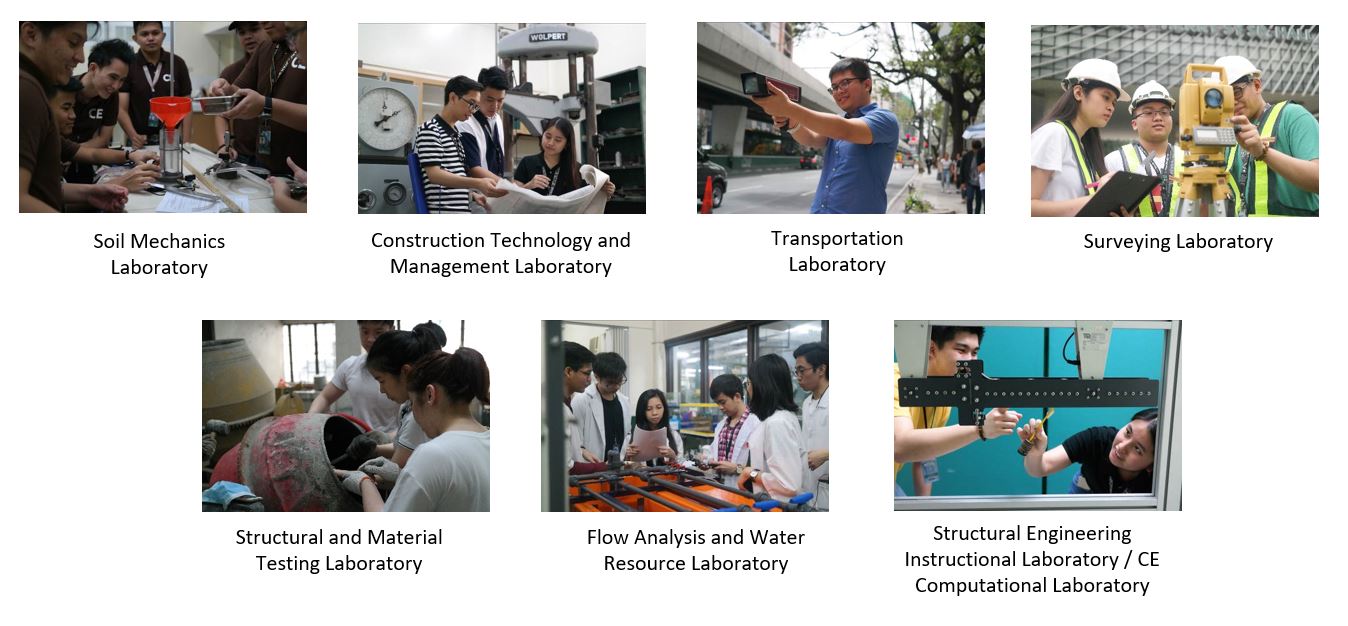 | Surveying Laboratory | M116 & 310 | Experiments are performed in the field. Students will learn about elementary and higher surveying; the use of surveying instruments, laying out simple, compound, reversed, spiral and vertical curves; and the different techniques in laying out curves in cases of interventions in the field. | •Total Station and various survey instruments |
