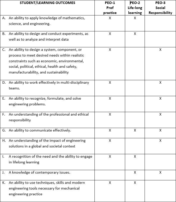 - PEO1 (leadership): Graduates will be leaders in the field of mechanical engineering, its allied disciplines such as manufacturing, and/or business enterprise.