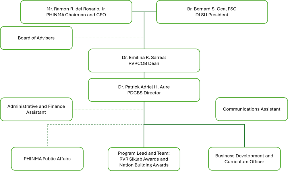 The Center will be headed by the Director reporting to the Dean of RVRCOB. The Director will coordinate with the Associate Dean curriculum and research; the Assistant Dean for External Affairs and Lasallian Mission for advocacy projects; the Assistant Dean for Quality Assurance for alignment with accreditation standards; the Director for the Center for Business Research and Development for externally funded research projects; and the Associate Dean for Research and Graduate Studies for internal research capability projects.