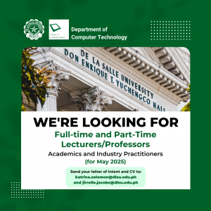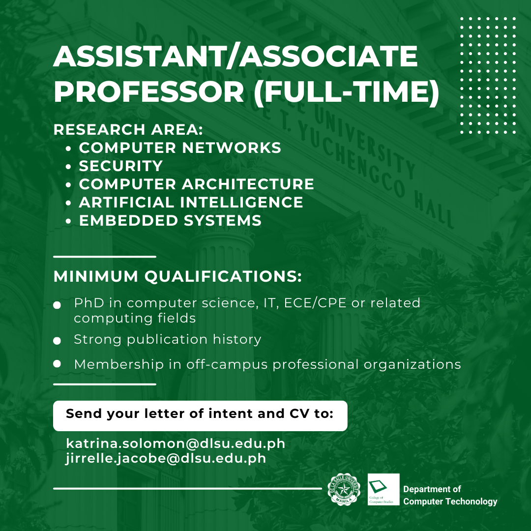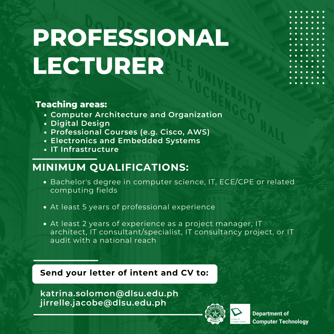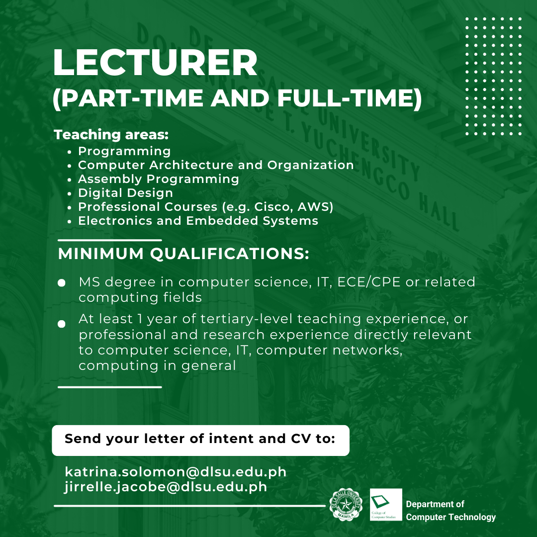 The Department of Computer Technology (DCT) is inviting academics and industry practitioners to apply for full-time and part-time positions available starting May 2025. Candidates must hold degrees in computer science, IT, ECE, CPE, or related computing fields, and possess expertise in one or more of the following areas: computer networks, security, computer architecture, artificial intelligence, electronics and embedded systems, digital design, IT infrastructure, programming, and professional courses such as Cisco and AWS.