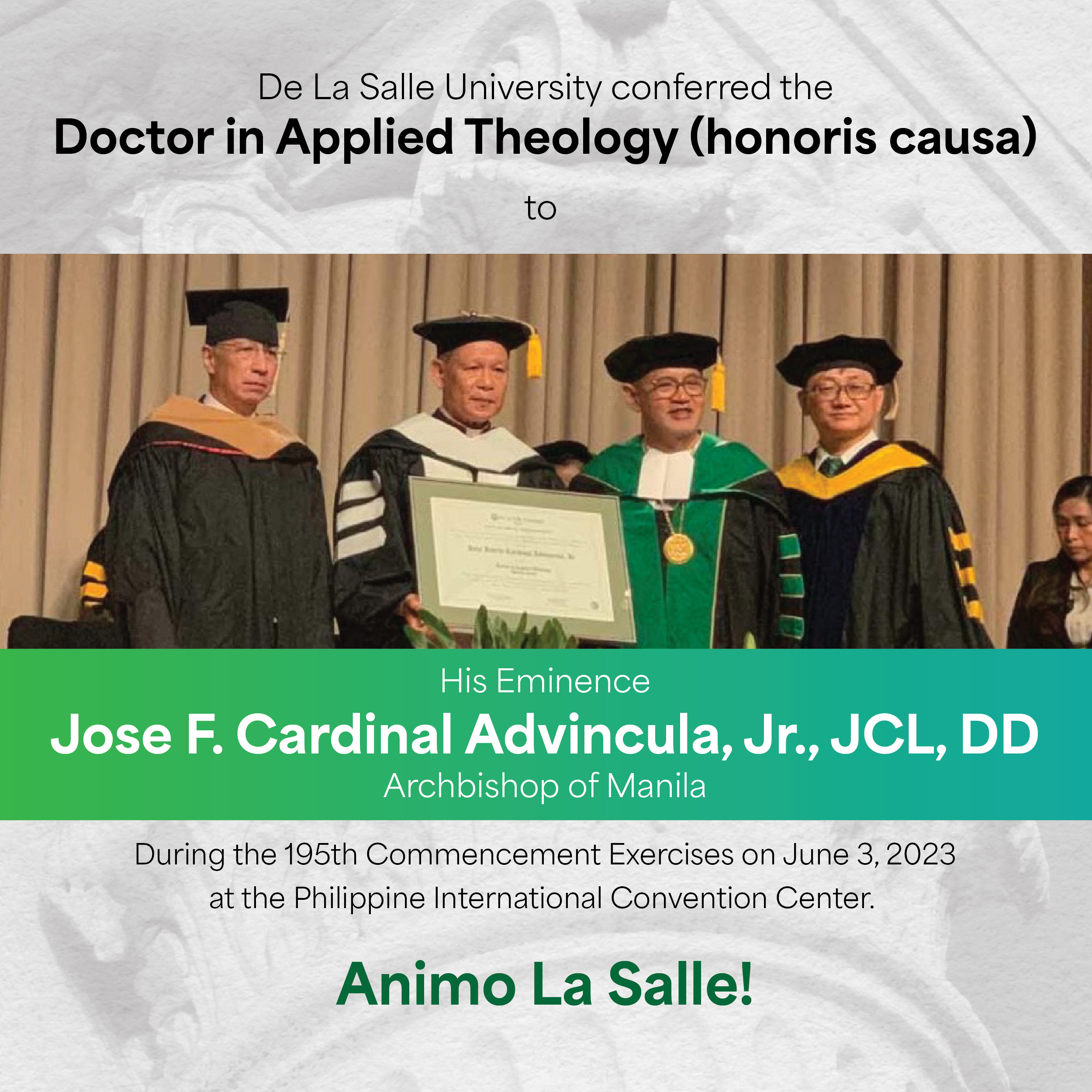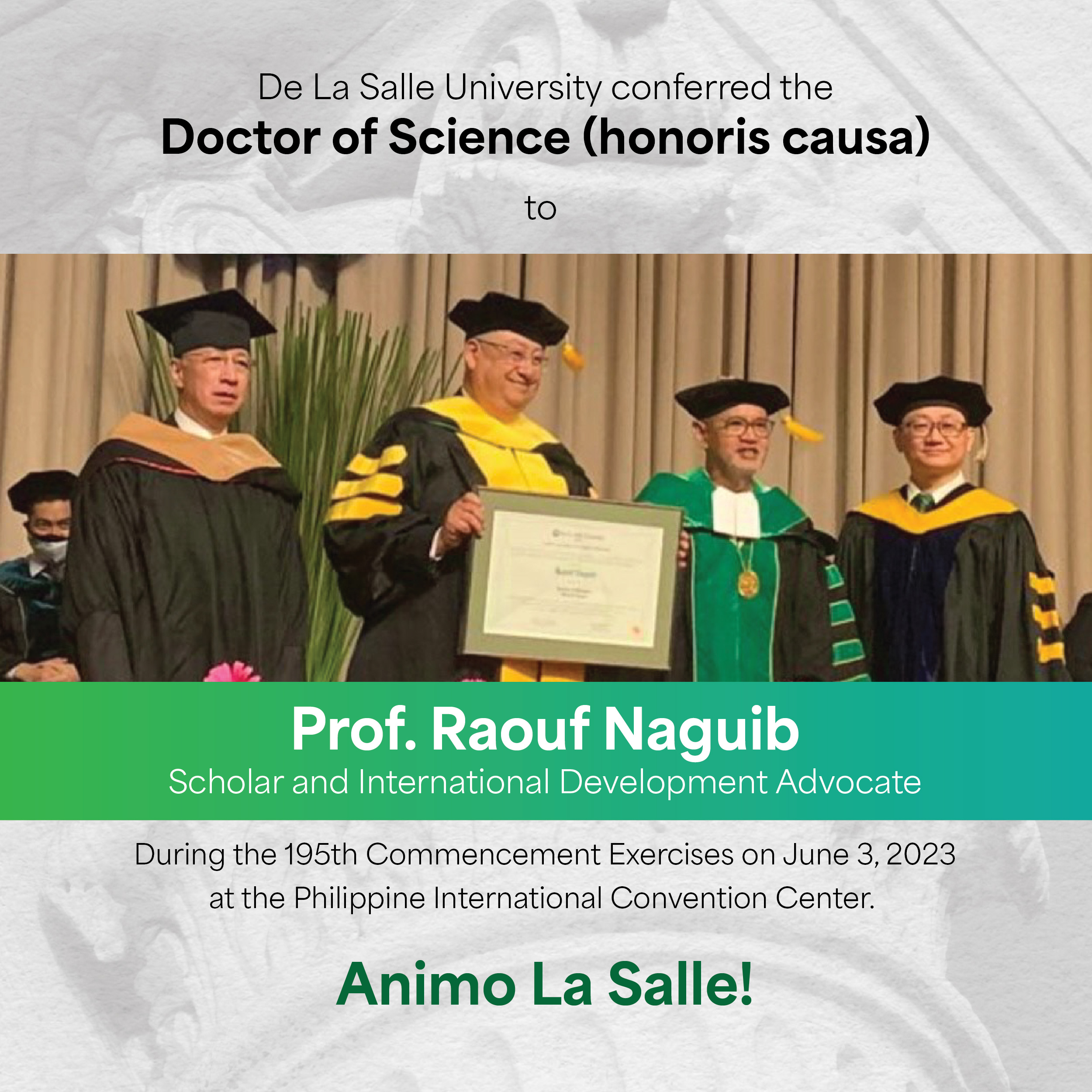 DLSU conferred the Doctor of Science (honoris causa) degree to scholar and international development advocate Prof. Raouf Naguib and the Doctor in Applied Theology (honoris causa) degree to the Archbishop of Manila, His Eminence Jose F. Cardinal Advincula, Jr., JCL, DD.