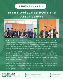 We were thrilled to welcome esteemed guests from DOST-PCHRD and DxD Hub of A*Star, Singapore to our DLSU Laguna Campus on March 16! Mr. Vincent Tumlos, Planning Officer of DOST-PCHRD, and Ms. Ho Yuan Lu, Vice President for Outreach & Talent of DxD Hub, joined us to witness our ongoing R&D projects and explore potential collaborations and mentoring opportunities in the near future.