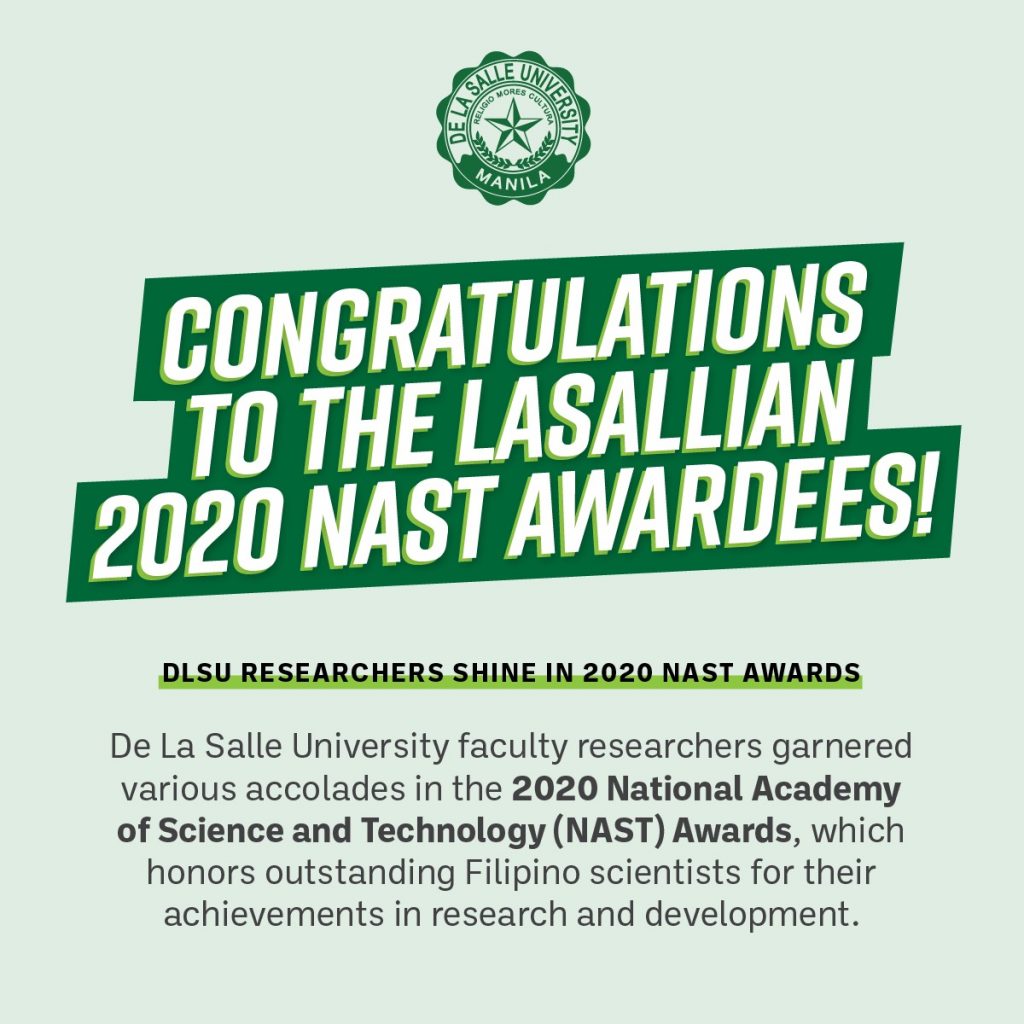 De La Salle University faculty researchers garnered various accolades in the 2020 National Academy of Science and Technology (NAST) Awards, which honors outstanding Filipino scientists for their achievements in research and development.