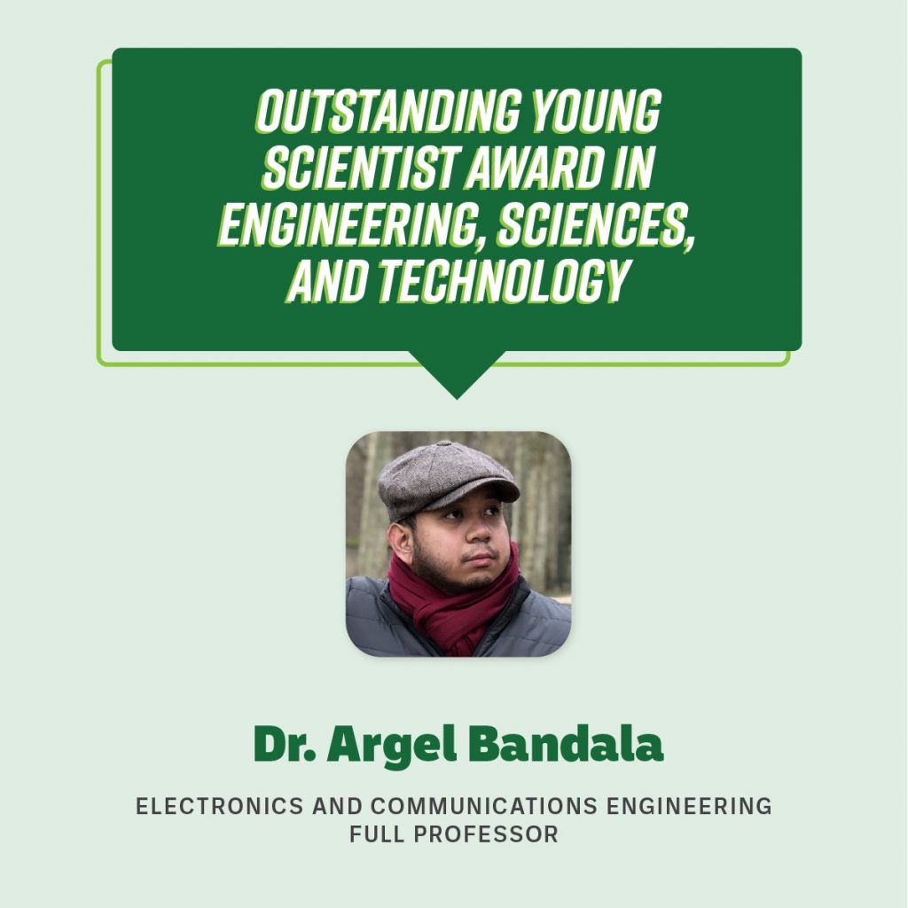 Electronics and Communications Engineering Full Professor Dr. Argel Bandala earned the Outstanding Young Scientist Award in Engineering, Sciences, and Technology. The award comes with a P1 million Department of Science and Technology (DOST) research and development grant.