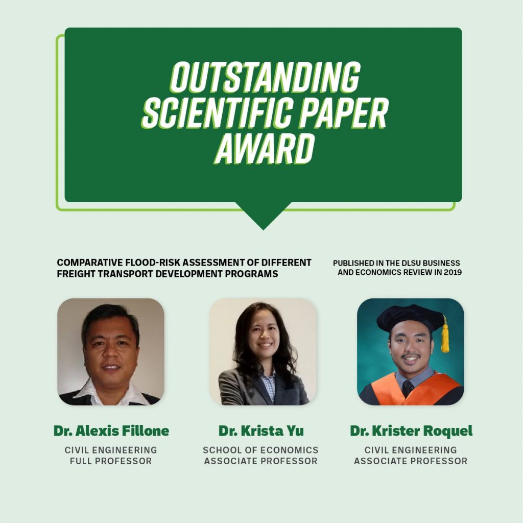 DLSU faculty members also earned the Outstanding Scientific Paper Award. They are Civil Engineering Full Professor Dr. Alexis Fillone, School of Economics Associate Professor Dr. Krista Yu, and Civil Engineering Associate Professor Dr. Krister Roquel, for their paper, “Comparative flood-risk assessment of different freight transport development programs,” published in the DLSU Business and Economics Review in 2019.