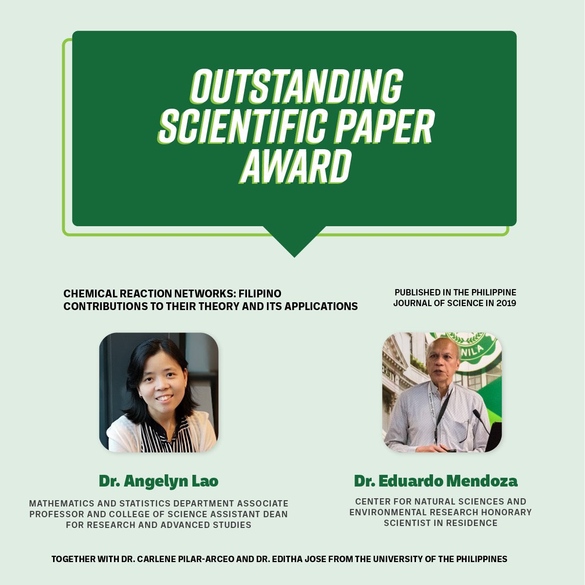 Mathematics and Statistics Department Associate Professor and College of Science Assistant Dean for Research and Advanced Studies Dr. Angelyn Lao and Center for Natural Sciences and Environmental Research Honorary Scientist in Residence Dr. Eduardo Mendoza, together with Dr. Carlene Pilar-Arceo and Dr. Editha Jose from the University of the Philippines, also received the Outstanding Scientific Paper Award for their paper, “Chemical reaction networks: Filipino contributions to their theory and its applications” published in the Philippine Journal of Science in 2019.