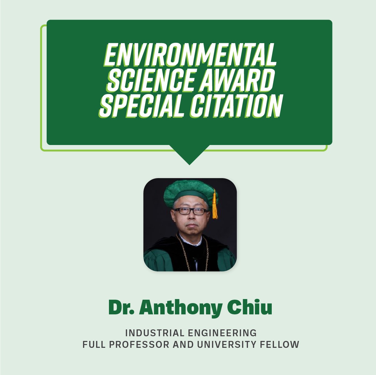 In addition, Industrial Engineering Full Professor and University Fellow Dr. Anthony Chiu received a special citation in the Environmental Science Award of the Academy.