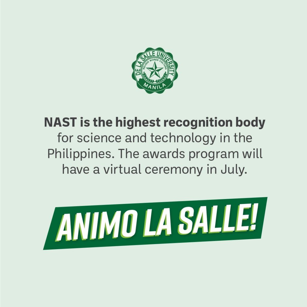 NAST is the highest recognition body for science and technology in the Philippines. The awards program will have a virtual ceremony in July.
