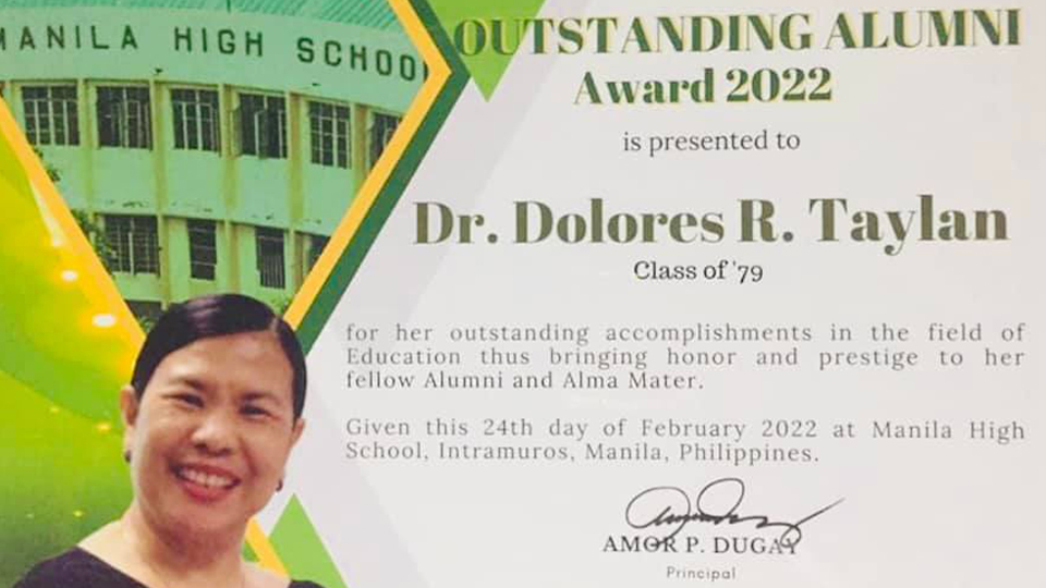 Dr. Dolores R. Taylan na ginawaran ng Outstanding Alumni Award 2022 ng Manila High School