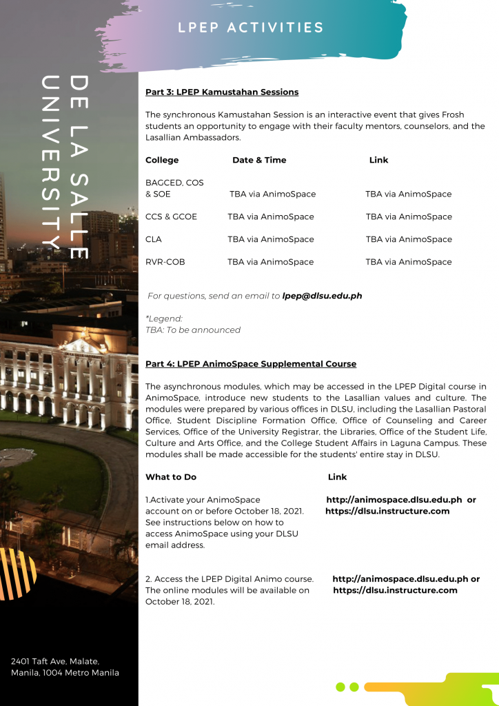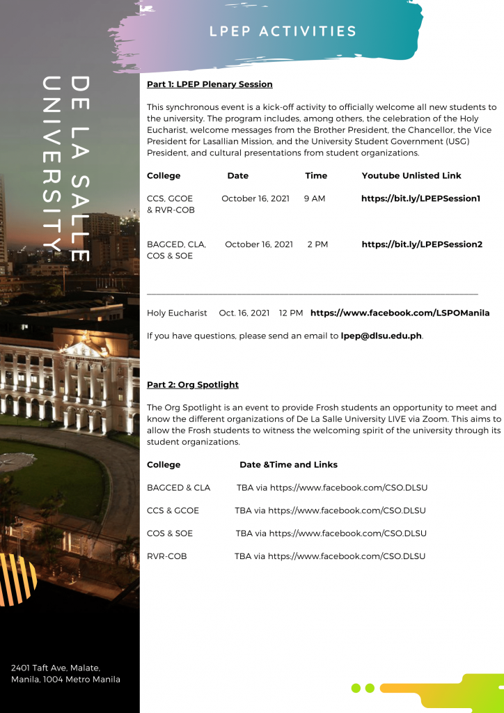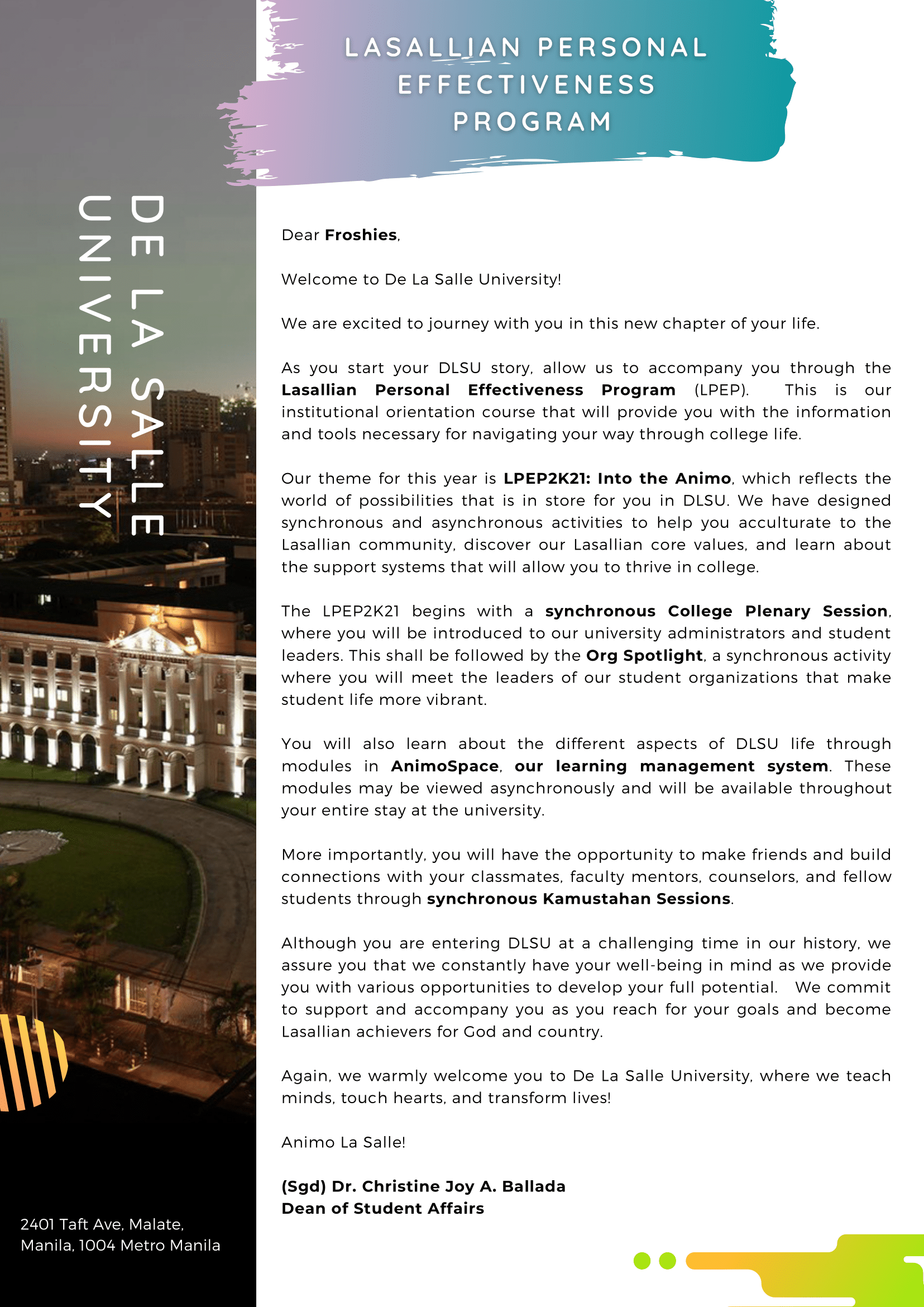 DLSU aims to assist students to positively transition to University Life to ensure their personal, academic and social success. The Lasallian Personal Effectiveness Program (LPEP) is the institutional orientation course that provides the information and tools necessary to begin students’ journey in DLSU.