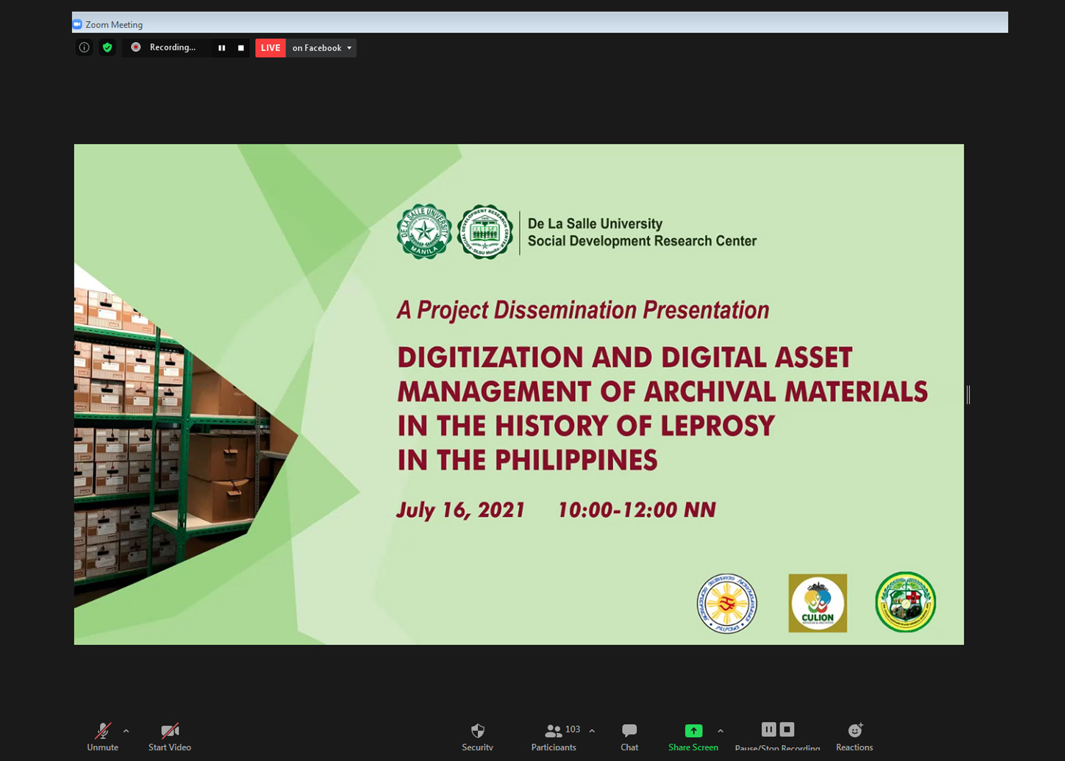 With this reminiscence, National Historical Commission of the Philippines Chair Dr. Rene Escalante provided context for the recently concluded SDRC study “Digitization and Digital Asset Management of Archival Materials in the History of Leprosy in the Philippines” during a dissemination held on July 16 via Zoom and Facebook Live. The study was led by a project core team composed of SDRC senior research fellow Dr. Ma. Elena Chiong-Javier, Center Director Dr. Melvin Jabar, archivist and former DLSU co-academic personnel Ms. Florbella Bongalos, and Computer Technology Department associate professor Dr. Joel Ilao. It primarily sought to assist the NHCP in prolonging the life of the Culion Museum and Archives (CMA)’s archival materials and in providing ease of access to users through the conversion of physical materials to digital files.