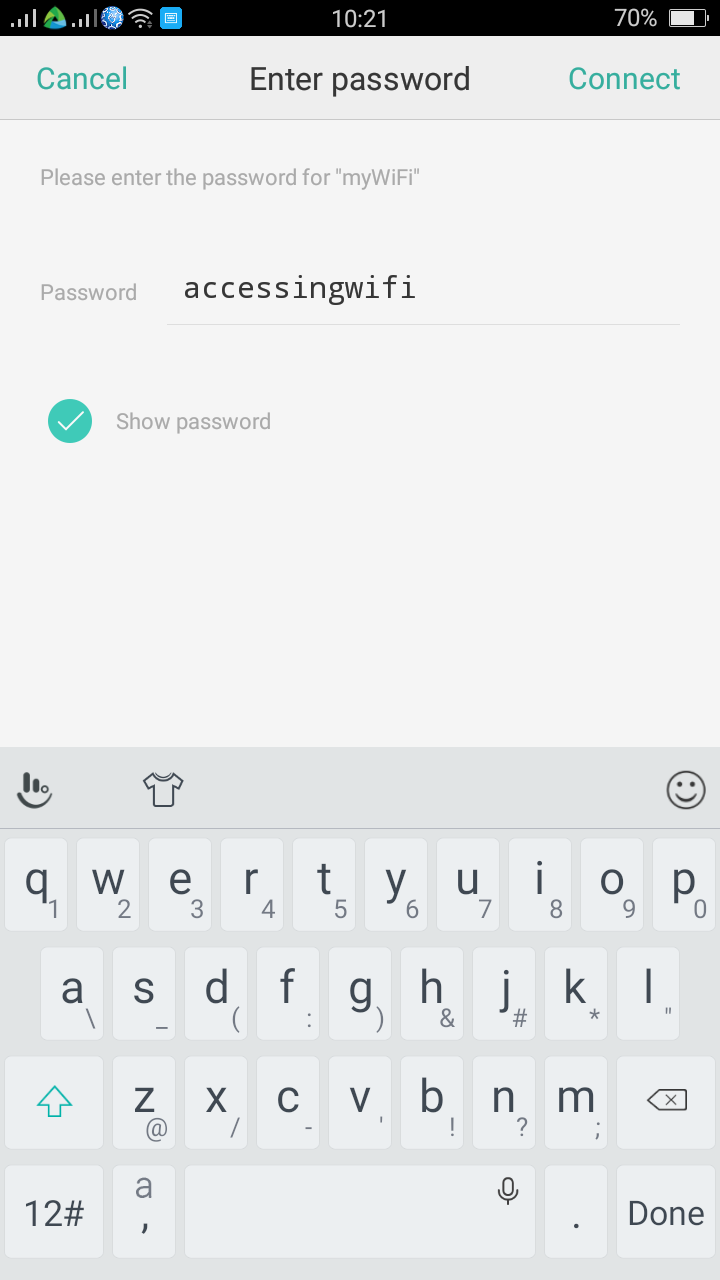 5.      Enter Password screen will be displayed.  Type accessingwifi in Password field.