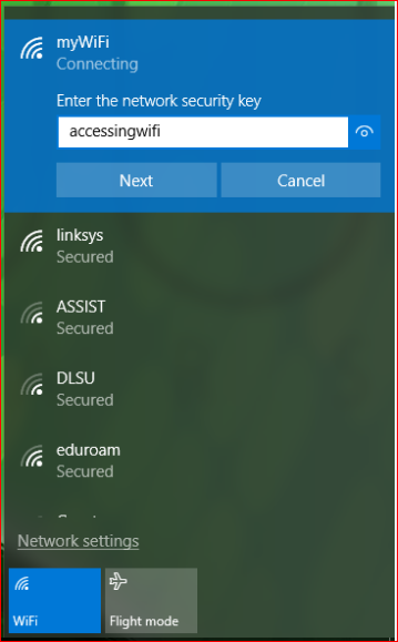 4. Type accessingwifi in Password field. Tick the Show password and Remember this network check box. Click OK.