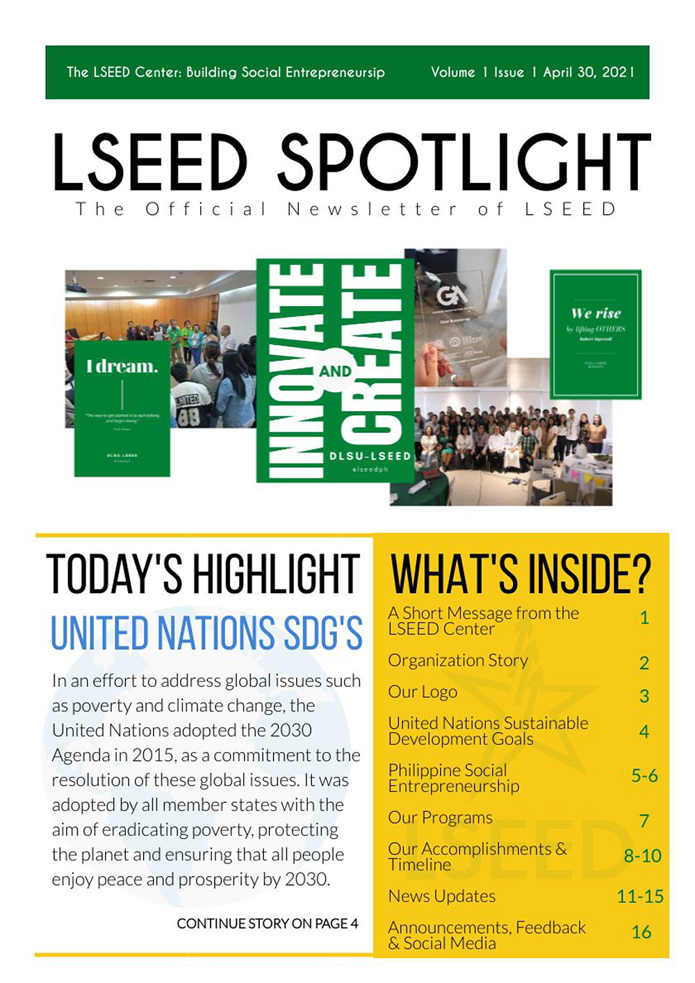 The Lasallian Social Enterprise for Economic Development (LSEED) Center is the flagship initiative of De La Salle University in areas of social entrepreneurship and social innovation. The organization goes way back in 2015, when it was developed with a primary mission of localizing the United Nations Sustainable Development Goals (SDGs) by working hand in hand with both students and marginalized communities in creating social enterprises.