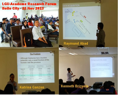 The local organizers led by the Iloilo City Cultural Heritage Conservation Council, the City Environment and Natural Resources Office (CENRO) together with the academe (De La Salle University-Taft, Manila; University of the Philippines Visayas-Iloilo City and Central Philippine University-CPU) held an LGU-Academe Research Forum on November 22, 2013, 9-12 AM at the Iloilo City Hall. The research forum intends to promote knowledge exchange between the academe and local government, with the intent of improving the contribution of both sectors to development work in Iloilo City. Specifically, the forum involves the presentation of past and current researches on transportation planning, disaster risk reduction and preservation of heritage buildings.
