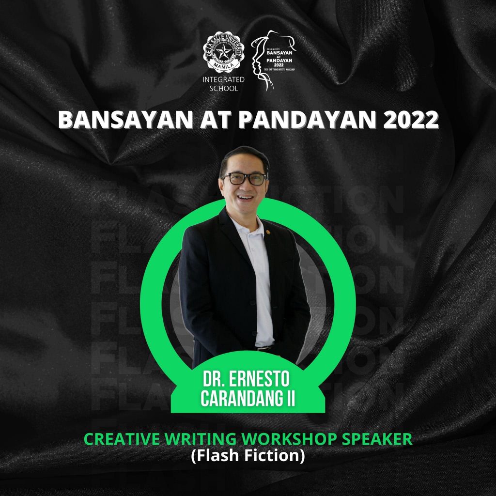 Malugod na pagbati kay Dr Ernesto V. Carandang II bilang panauhing tagapagsalita sa paksang Flash Fiction sa DLSU SHS BANSAYAN AT PANDAYAN 2022. Pormal na binuksan ang programa ng BANSAYAN AT PANDAYAN sa araw na ito at matatapos sa Biyernes, Hunyo 10, 2022.