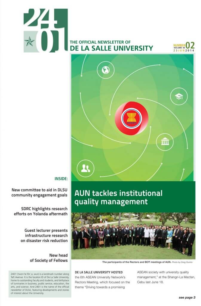 2401 (twen’të fôr’, ö, wun) is a landmark along Taft Avenue. It is the location ID of De La Salle University-Manila, home to outstanding faculty and students, and birthplace of luminaries in business, public service, education, the arts, and science. And 2401 is now the new name of the official newsletter of DLSU-Manila, featuring developments and stories of interest about the university.