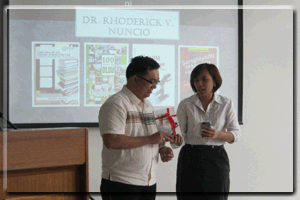 Four new and recent books were launched by SDRC Director Rhoderick V. Nuncio, as author or editor, on February 21, 2013 at the European Documentation Centre of the Henry Sy, Sr. Hall.  Sponsored by the Bienvenido N. Santos Creative Writing Center, the launching highlighted the presentation of the four titles to Dr. Nuncio by the publishers:  Ang Lihim ng Ultramar, by Ms. Ma. Ailil Alvarez, Deputy Director, UST Publishing House; 100 Aklat sa Aking Pagkamulat: Pagbasa, dagling-suri, at Paanyaya, by Ms. Lourdes Lopez and Mr. Alain Padilla of C&E Publishing; 100 Bago sa DLSU, by Ms. Cristina Tayag Balagtas, Marketing Manager of Central Books; and Sanghiyang sa Mundo ng Internet, by Ms. Haidee Cedro of Vibal Foundation.