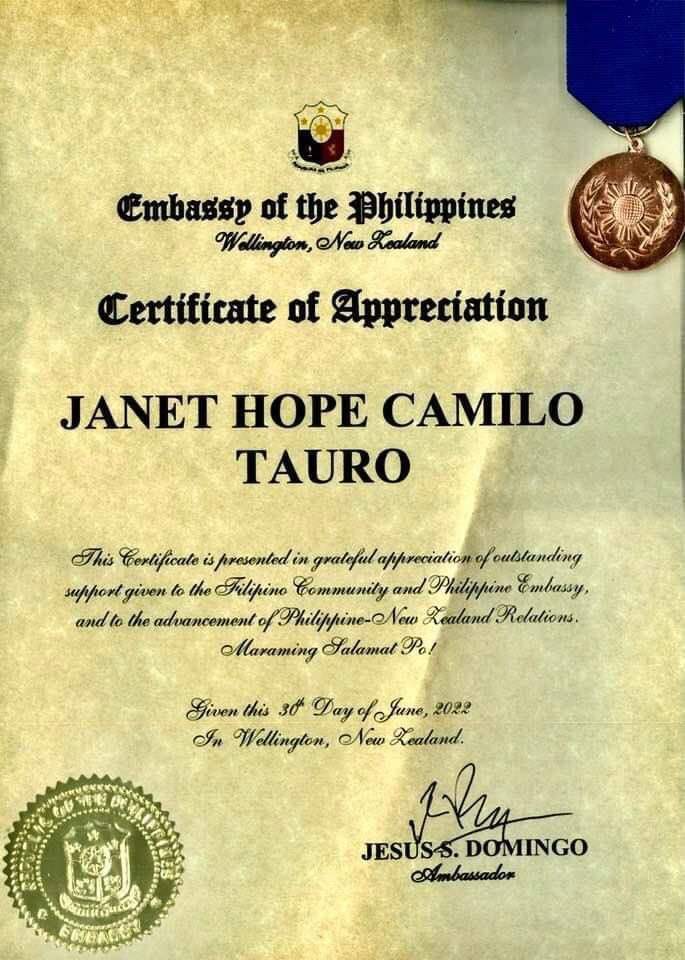 Malugod na pagbati kay Dr. Janet Hope Camilo Tauro sa pagkilala ng Embahada ng Pilipinas, Wellington, New Zealand sa kaniyang napakahalagang ambag sa pagsusulong ng mabuting relasyon sa pagitan ng Pilipinas at New Zealand.