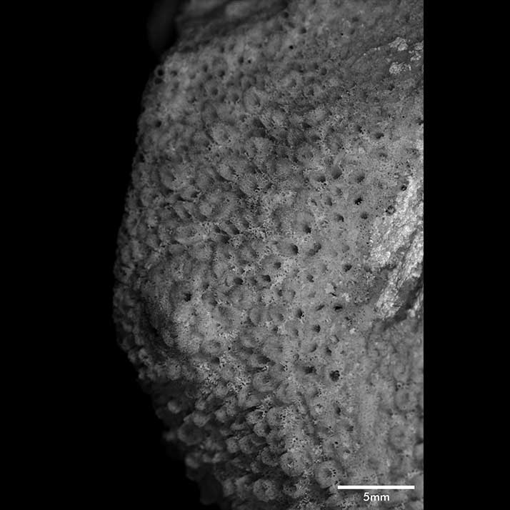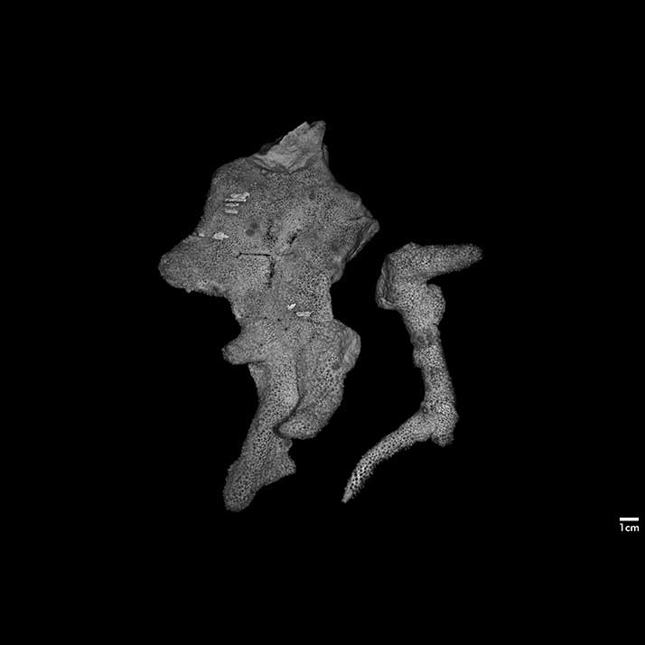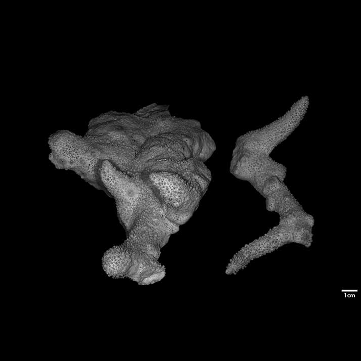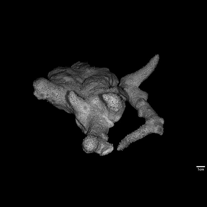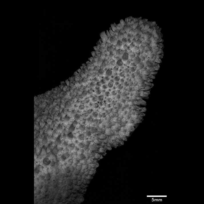 Corallum consisting of heavy, creeping, extensive base with stout, usually arcuate branches produced at edges. Base 2.8 cm to 4.4 cm thick, both surfaces irregular, nodulous.
