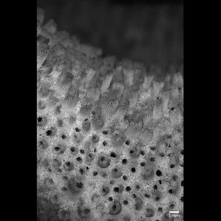 Axial corallites 3 mm across, very slightly exsert; wall moderately thick, very porous. Radial corallites on upper surface of various heights and diameters, crowed, mixed together. Height ranging from even with surface but for a low ring circumscribing calice to 3-3.5 mm, the latter just below apex of branches where they are tallest. Diameter ranges from 0.6 for lowest corallites to slightly over 1 mm across mouth of tallest one. Prominent corallites perpendicular to surface, tall ones towards apex slightly appressed but appear vertical being reflexed; spout-shaped, dimidiate; distal wall slightly above general surface, lower wall very high, thin or slightly thickened at edge; distinctly costate, very porous. Lower lip of smaller radials ligulate or acuminate oriented in any direction. Corallites on lower surface distant, subimmersed or plush with surface so this side appears smooth; some corallites obsolescent..