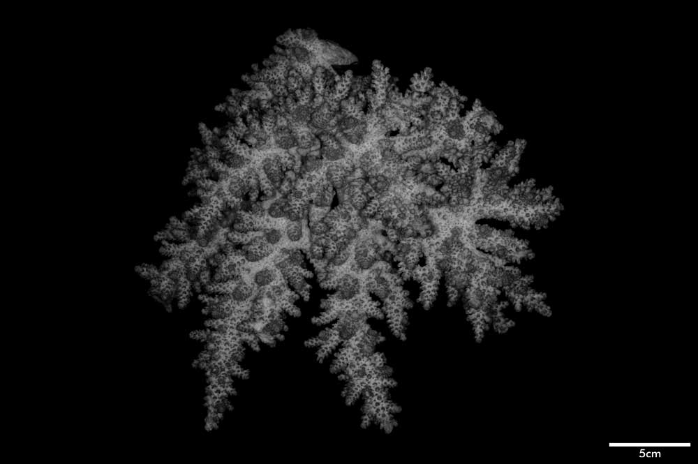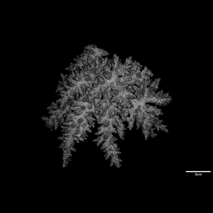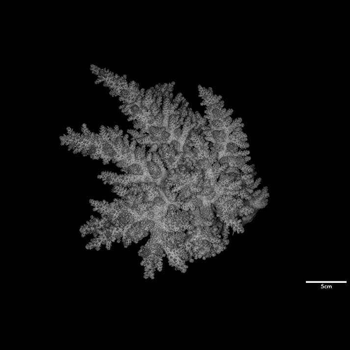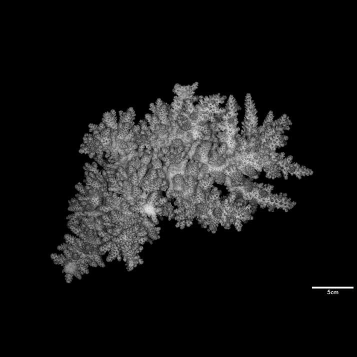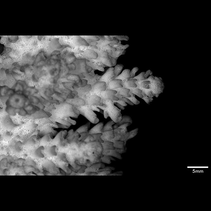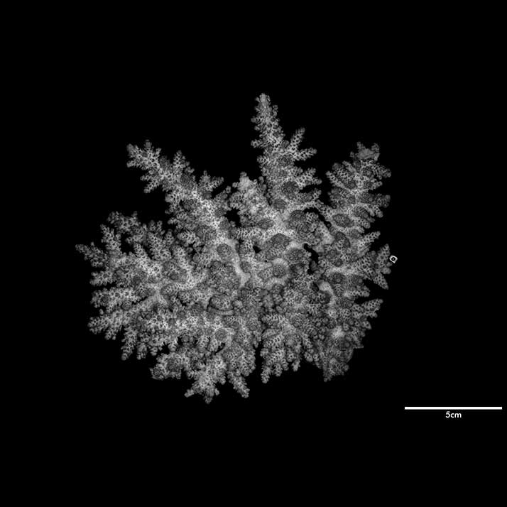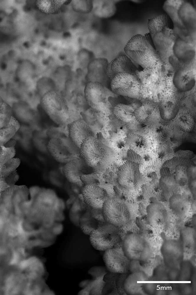 Corallum very crowded arborescent clumps of stems, branches and branchlets. Stem presumably oblique so lower and upper surfaces distinguishable; heavy, 3.5 cm diameter, closely divided into heavy gradually tapering branches. One branch: 15.5 cm long, 2 cm diameter at base, subdivided. Branches have abundant short branchlets all around but those on lower side less abundant. Branchlets on lower side almost vertical; long ones fewer on proximal region than towards apical region; simple, nonproliferous ones up to 1.3 cm high, slightly tapering to rounded or conical tips; several proliferous ones; proximal ones more terete than distal because radial corallites less prominent on former. Branchlets on upper surface crowded, rough sided because of prominent radials; tapering into acute tips; most bear branchlets. One simple unbranched branchlet 1.3 high, 6-8 mm across at base.