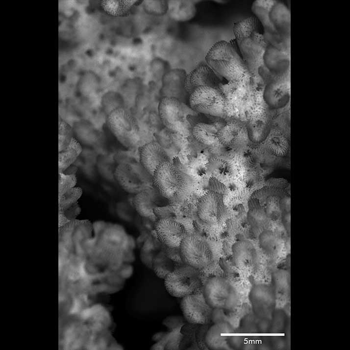 Axial corallites 3 mm across, very slightly exsert; wall moderately thick, very porous. Radial corallites on upper surface of various heights and diameters, crowed, mixed together. Height ranging from even with surface but for a low ring circumscribing calice to 3-3.5 mm, the latter just below apex of branches where they are tallest. Diameter ranges from 0.6 for lowest corallites to slightly over 1 mm across mouth of tallest one. Prominent corallites perpendicular to surface, tall ones towards apex slightly appressed but appear vertical being reflexed; spout-shaped, dimidiate; distal wall slightly above general surface, lower wall very high, thin or slightly thickened at edge; distinctly costate, very porous. Lower lip of smaller radials ligulate or acuminate oriented in any direction. Corallites on lower surface distant, subimmersed or plush with surface so this side appears smooth; some corallites obsolescent..