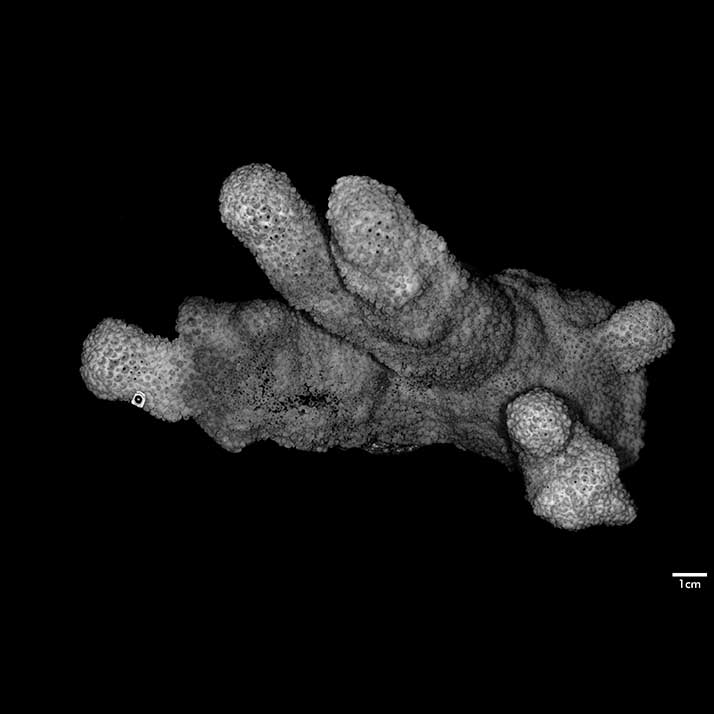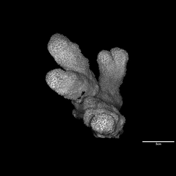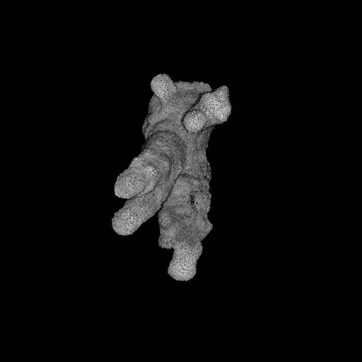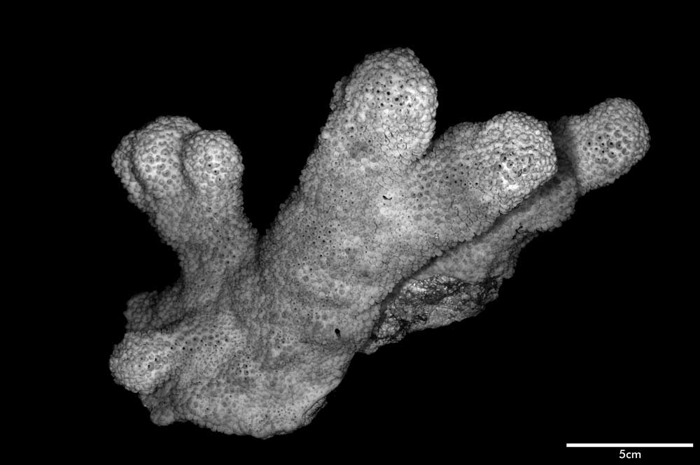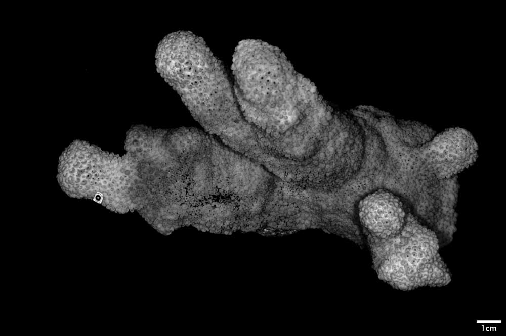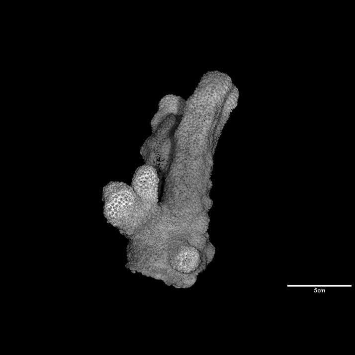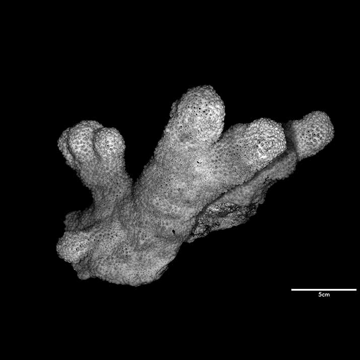 Corallum consisting of heavy vertical stems (not plates) arising from creeping base. Biggest stem 12 cm high, 4.4 x 3.7 cm across at narrowest level, bifurcated into slightly attenuate branchlets – 4.5 cm long, 2.9 x 3.2 cm across at base and 2.3 x 2.5 cm across just below tip. Apex well rounded. Stems and branchlets made somewhat angular by low longitudinal ridges, swollen here and there. Creeping base heavily epithecate, closely hugging substratum.