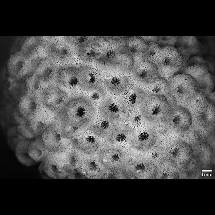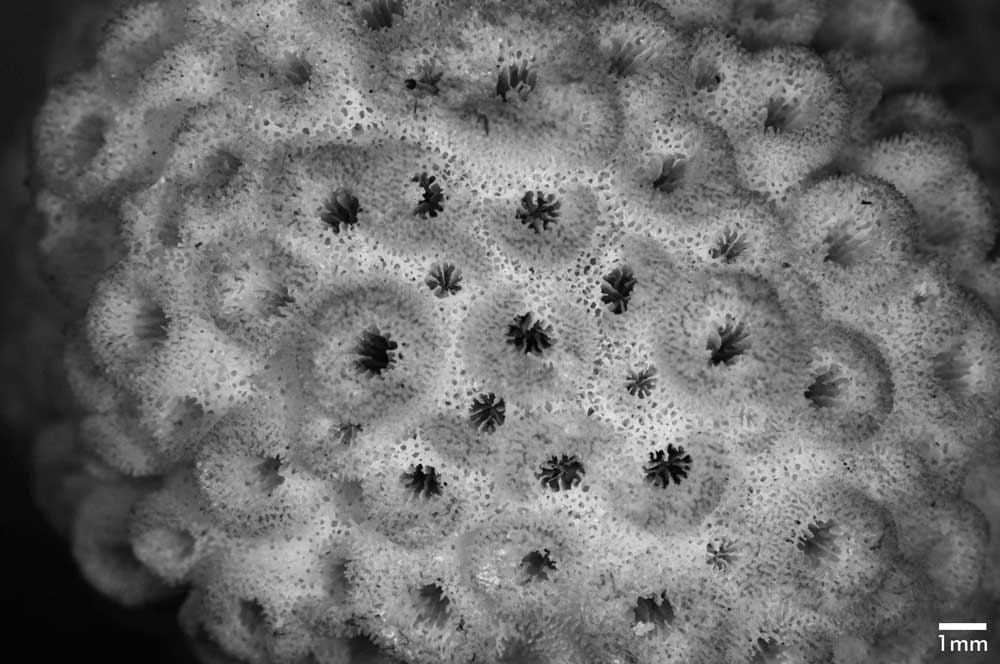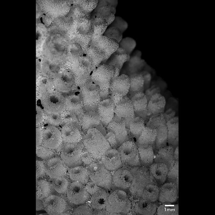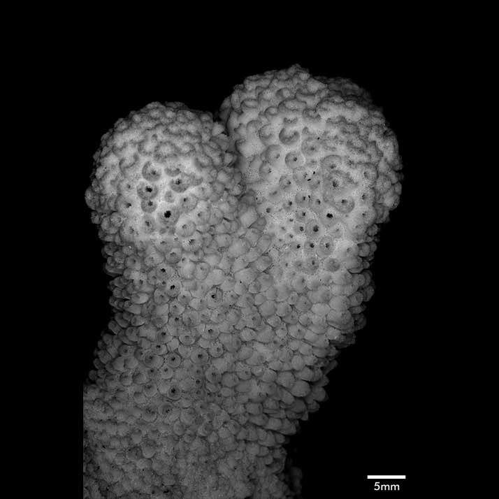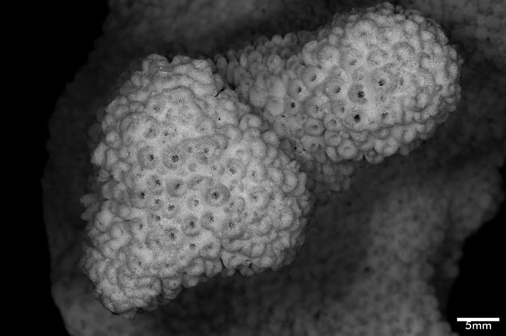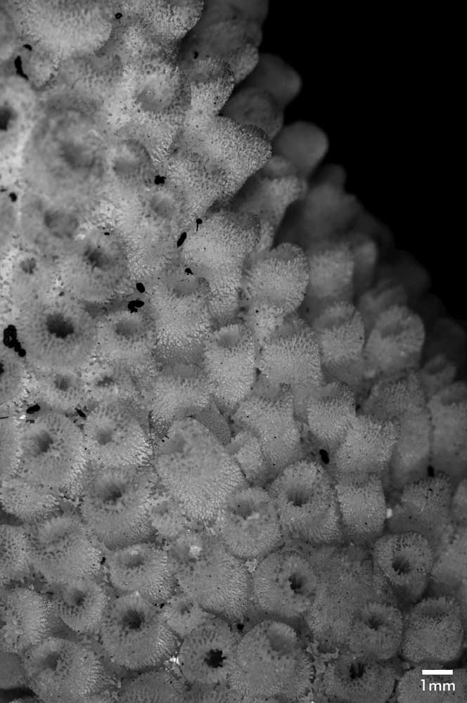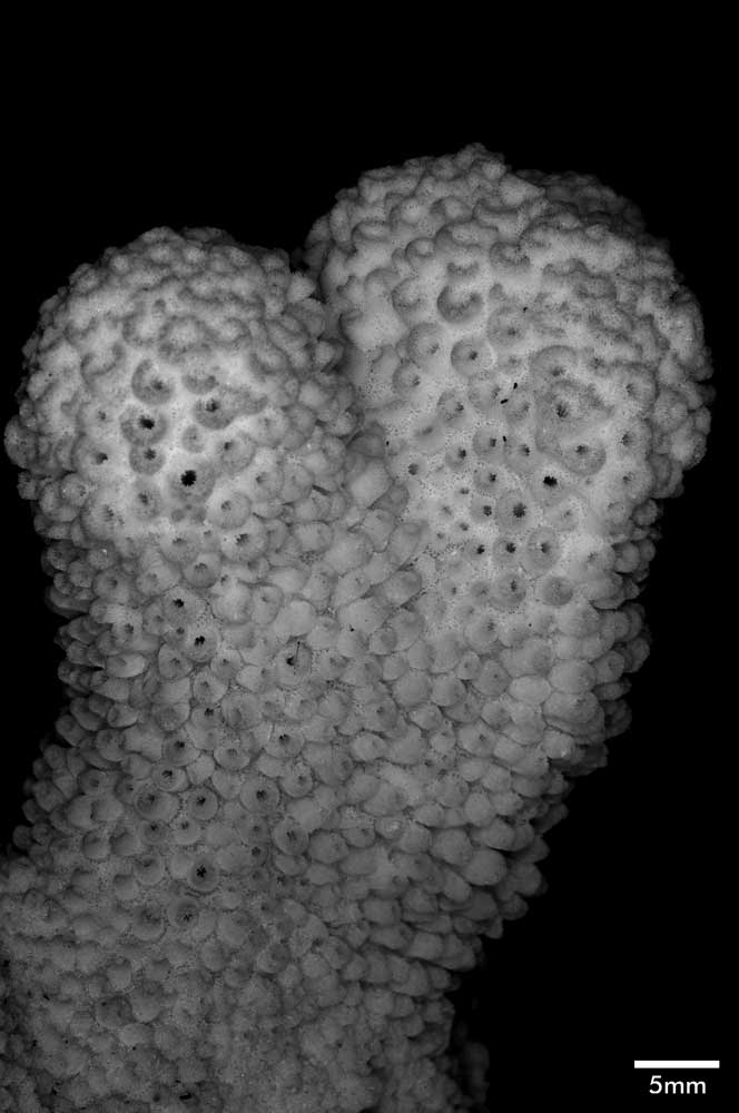 Corallites crowded, protruding, various sizes intermixed; calices round, terminal slightly oblique. Apical corallites (several on each apex) slightly exsert, 3-3.5 mm diameter; wall thick, porous rim well rounded. Radial corallites tubular, longest and widest just below tips of branches, becoming lower and smaller towards base; large ones towards tips usually with inflated bases, distinctly ascending but not appressed; up to 4 mm long, 1.5 mm across at rim, 2.5 mm across at base. Large ones towards base almost right angle to surface, uniformly cylindrical, 2 mm diameter, 3 mm high, small ones of various diameters, some as low as 0.5 mm interspersed among large ones. Wall thin compared on one side but this is not the upper side always, except among corallites near apices.