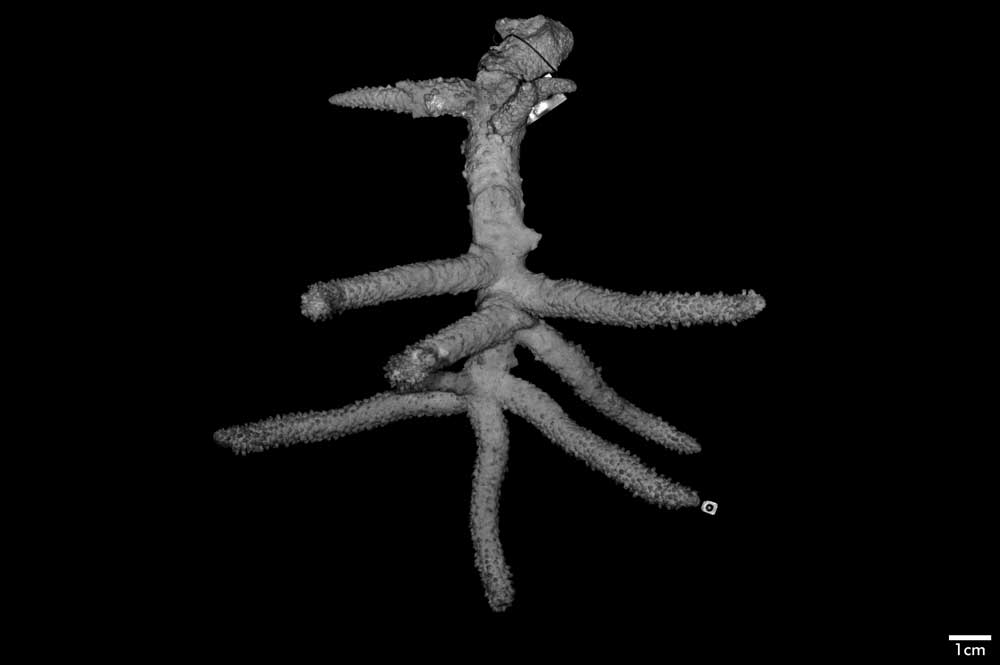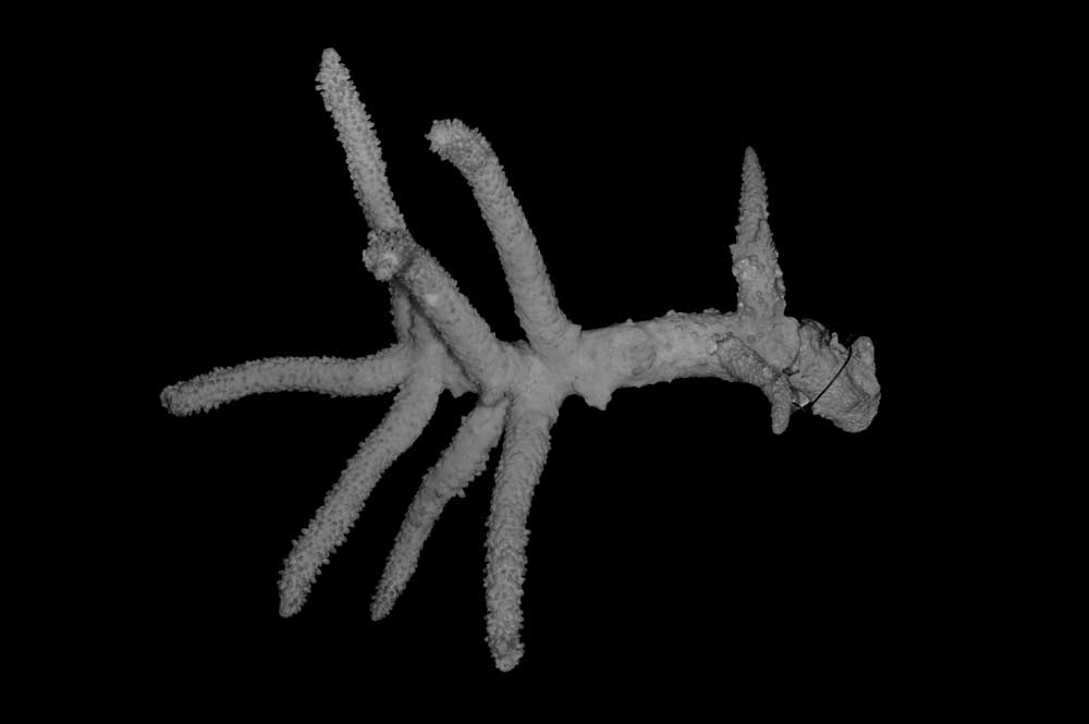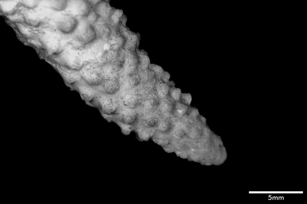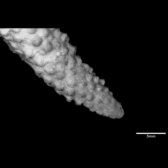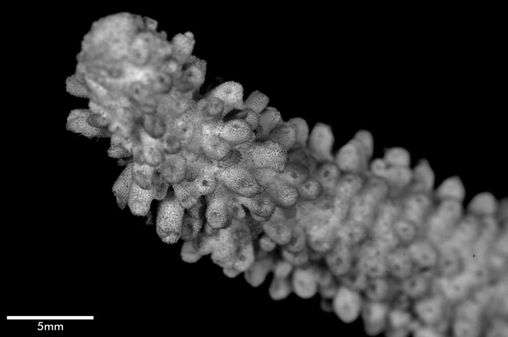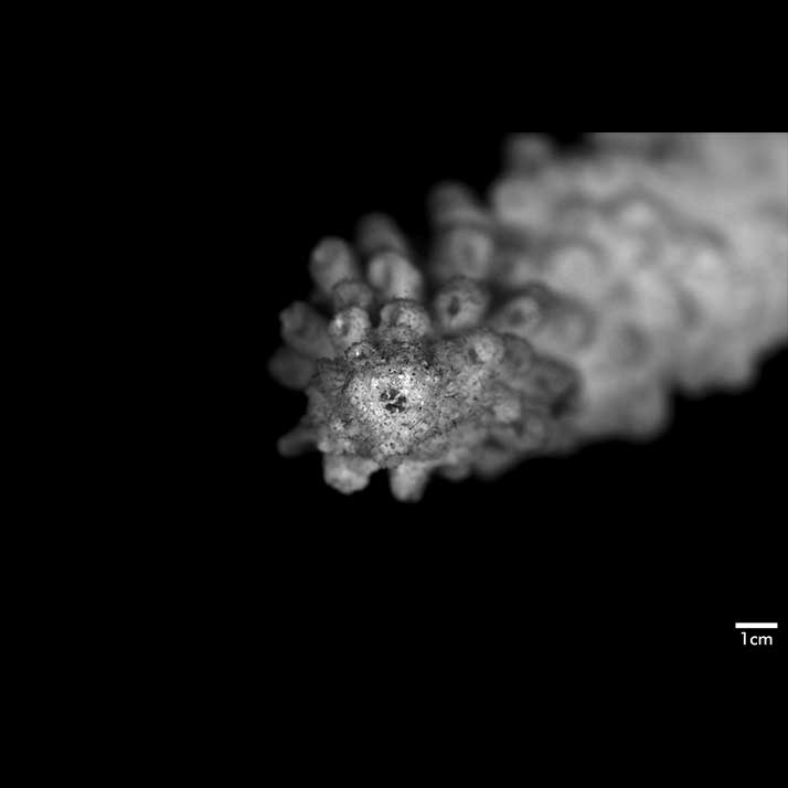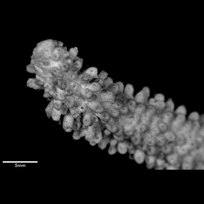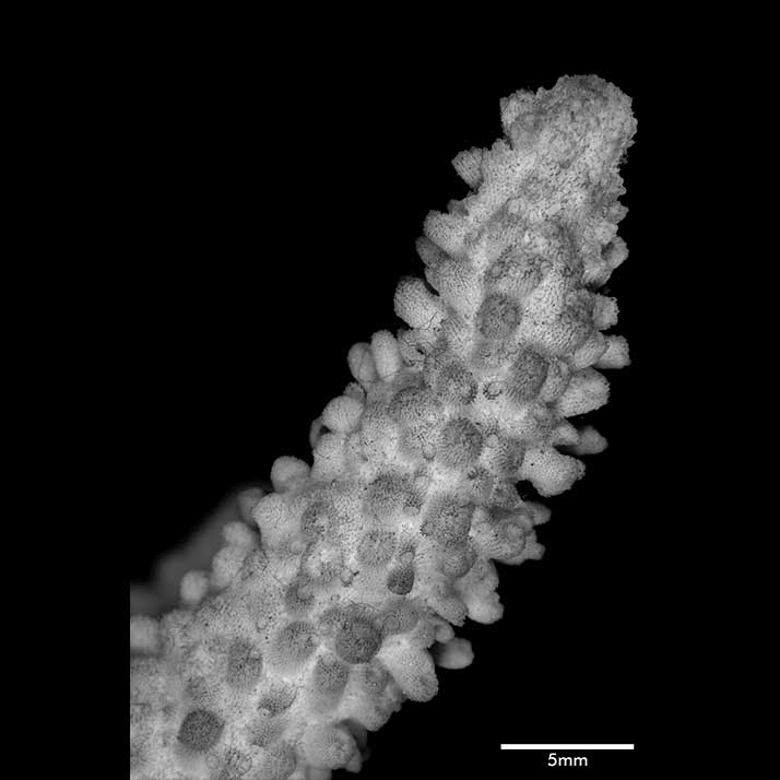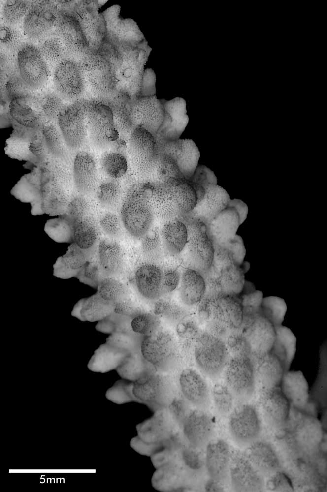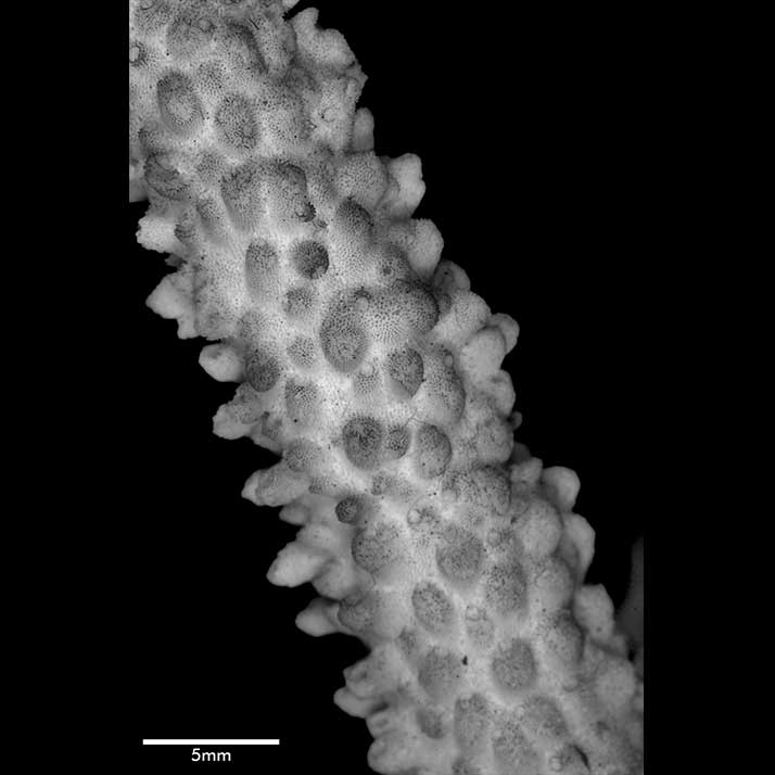 Axial corallite cylindrical 2-3 mm diameter, 1.5 mm exsert or conical (very slightly exsert). Calice relatively small. Wall moderately thick, closely costulate, finely echinulate at base; porous; edge rounded or slightly so. Radials not very crowded; various sizes and positions. Most prominent ones cylindrical with rounded calice, erect, 1.5 mm across, 4 mm high when with 1 or 2 small buds. Nonproliferous tall radials up to 3 mm high, 1.3 mm diameter, almost erect or appressed; base wider than apex; calice oval, facing horizontally upward, mostly because of upward bending of lower wall; wall thick, abundantly echinulate, seriate or nonseriate. Towards proximal regions, these nonproliferous corallites become lower, distinctly conical with calicinal opening on upper wall, so apex of cone projects to lower side. Interspersed among prominent radials are lower, smaller ones (diameter below 1 mm) of same shape, mostly appressed tubular with calices facing in all directions, even downward; their wall thin; none actually immersed or subimmersed. Extensive areas towards bases of stem and branches are bare of corallites.