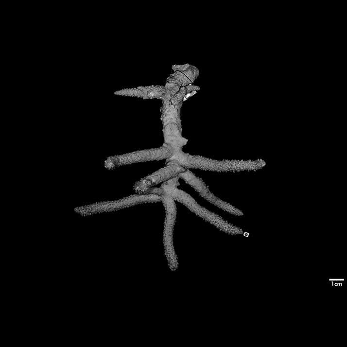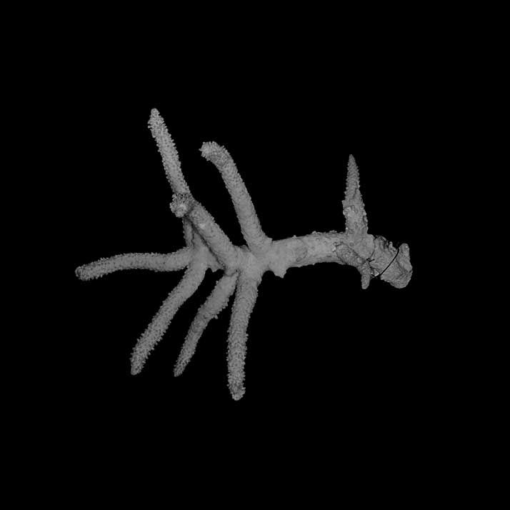 Corallum arborescent, closely branched. Branches long, stout terete, mostly arcuate, very slightly tapering. Stem 18.5 mm across near base. A branch is 12.5 mm across at base, 10 mm at middle, 6 mm just below apex; 11.5 cm long. Surface rough because of inequality of radials. Base of stem and branches smooth because of obsolescence of corallites.