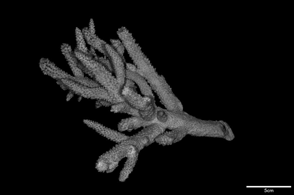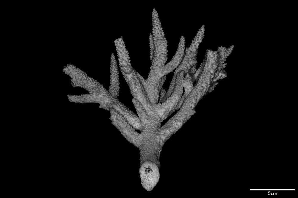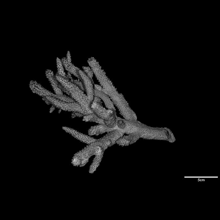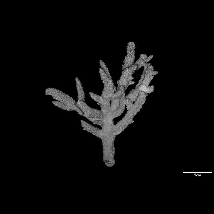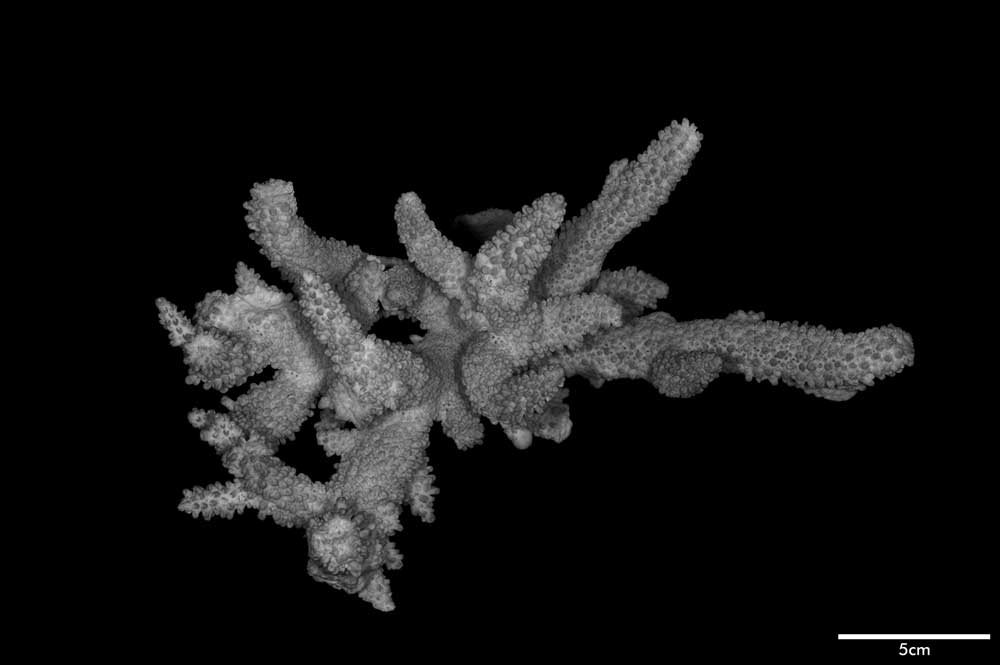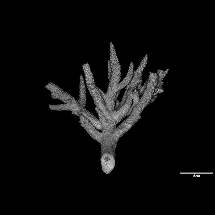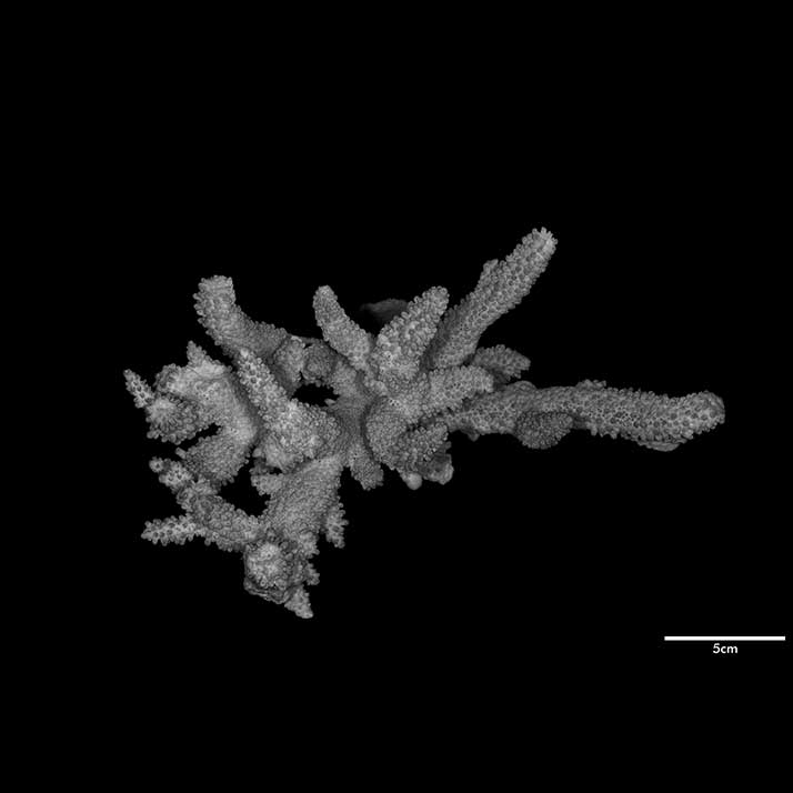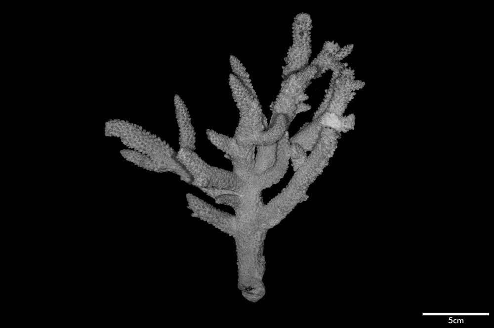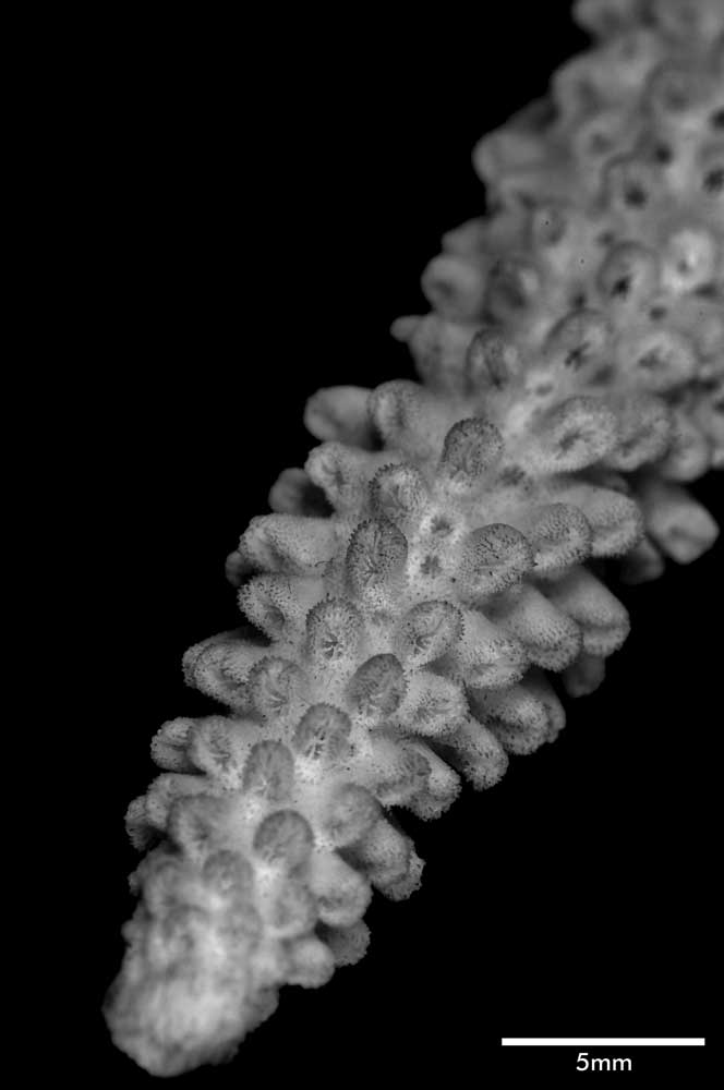 Corallum arborescent; stem presumably oblique (the present specimen consists of one stem and all its branches) 24 cm long. Branches wide spreading but not vertical to stem, some arcuate; tapering in upper half to acute apex; one branch 9.8 cm long, 1.3 cm across at base, with a short branchlet; another 10 cm long, 1.7 x 1.3 across at base has several branchlets. Upper surface crowded with unequally protruding corallites; lower surface slightly flattened, corallites low, distant. Terminal branchlets tapering, one 5 cm long has basal diameter of 1.1 cm; another 4 cm long, 9 mm across at base.
