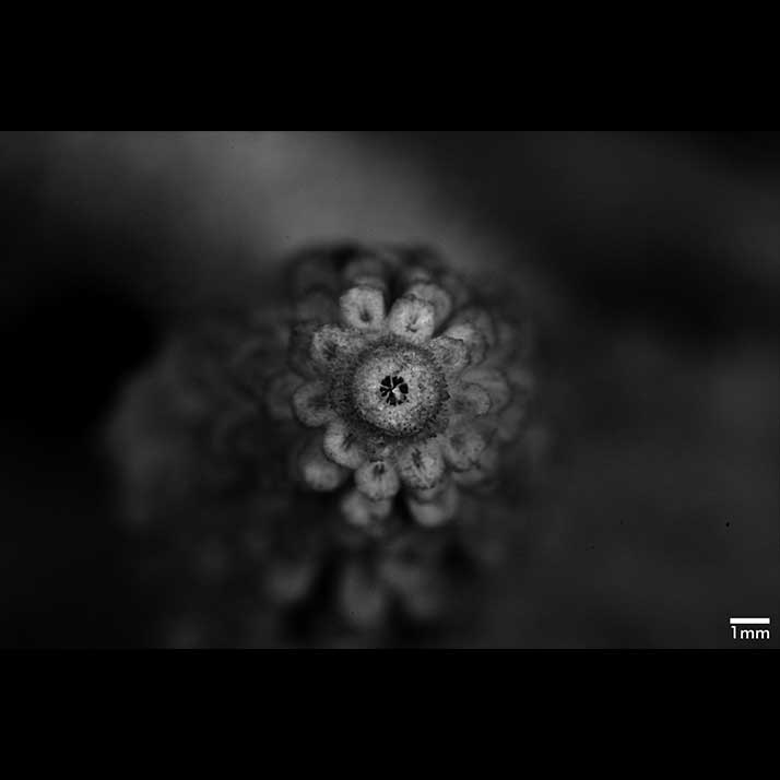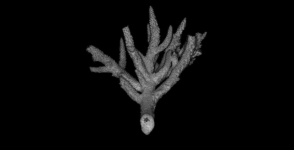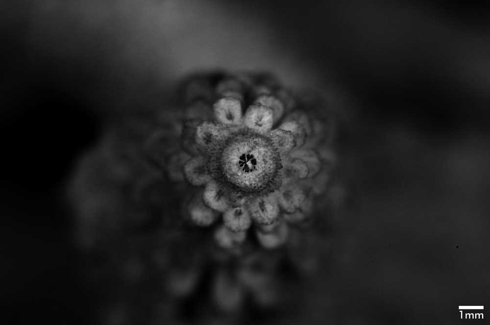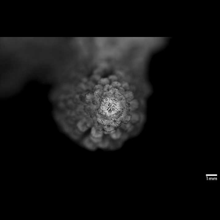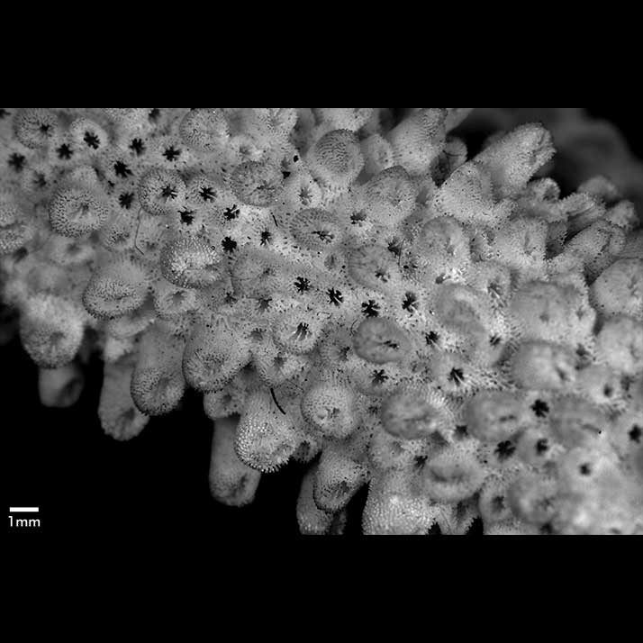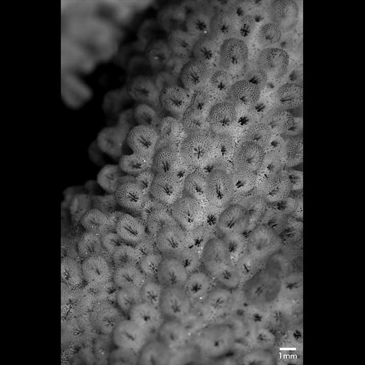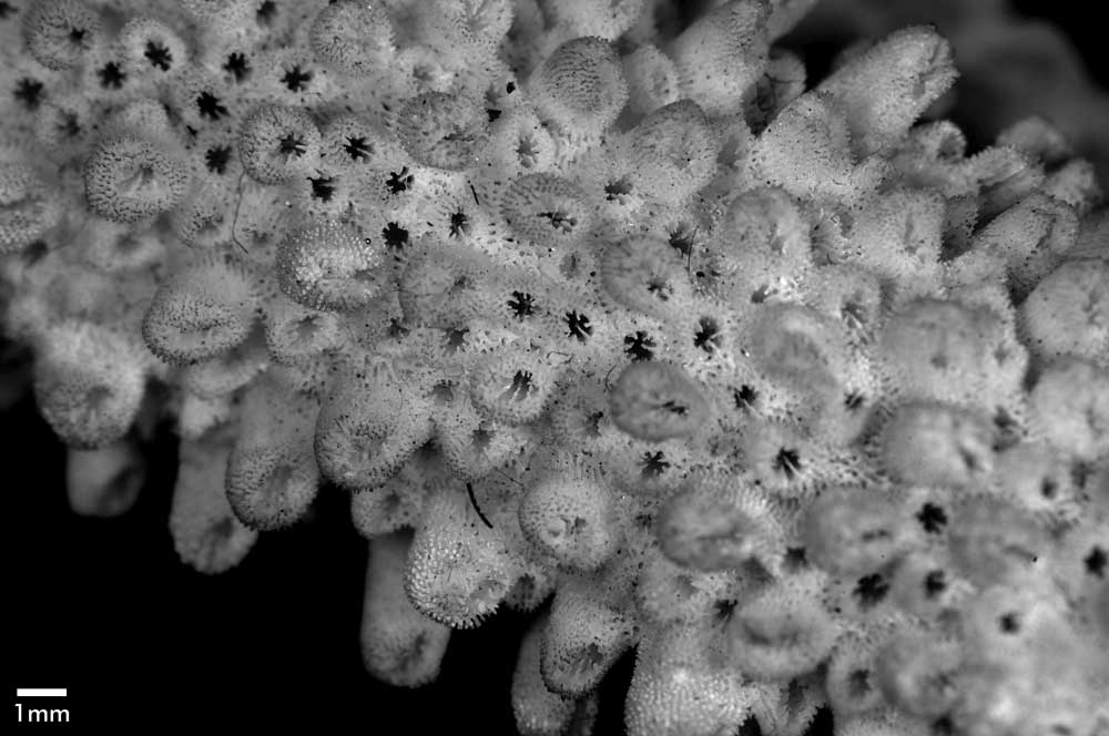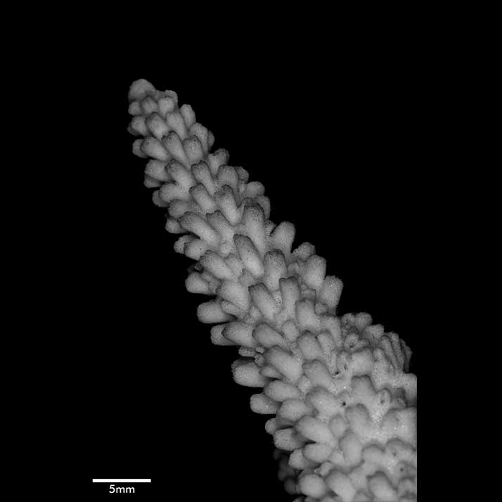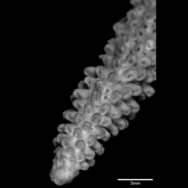 Radial corallites unequal in height towards apical region, prominent ones very compressed, tubular, with elliptical calices facing upward, 1.5 x 2-2.5 mm across, 3.5 mm long standing about 45 degrees; wall porous but not fragile, costulate, finely echinulate on base, edge not rounded. Toward lower region, wall becomes thicker, echinules coarser, seriate or not, costules no longer evident, calices narrow, slitlike, apex well rounded. Among these prominent corallites are smaller, lower ones with thin wall, rounded calices, mostly nariform with calices facing in several directions – not always upwards. Septa in two cycles – primaries wide, directives distinguishable; secondaries narrow, sometimes not complete cycles. Lower down on branches and stems, radials become verruciform or low nariform with thicker walls and wider calices. Septa in 2 cycles with primaries very wide, almost meeting at center. Corallites on lower surface slightly protruding, calices rounded, septa in 2 cycles. No immersed corallites, except within some axils of branches.