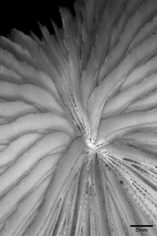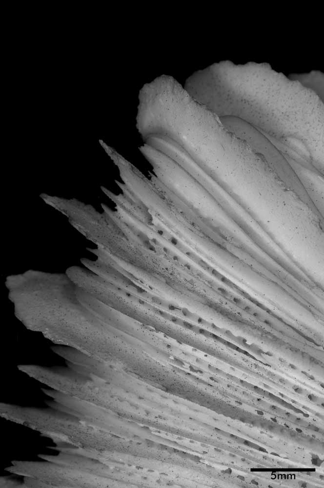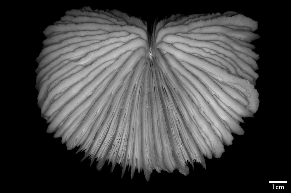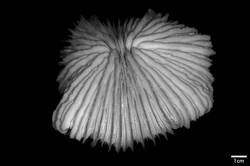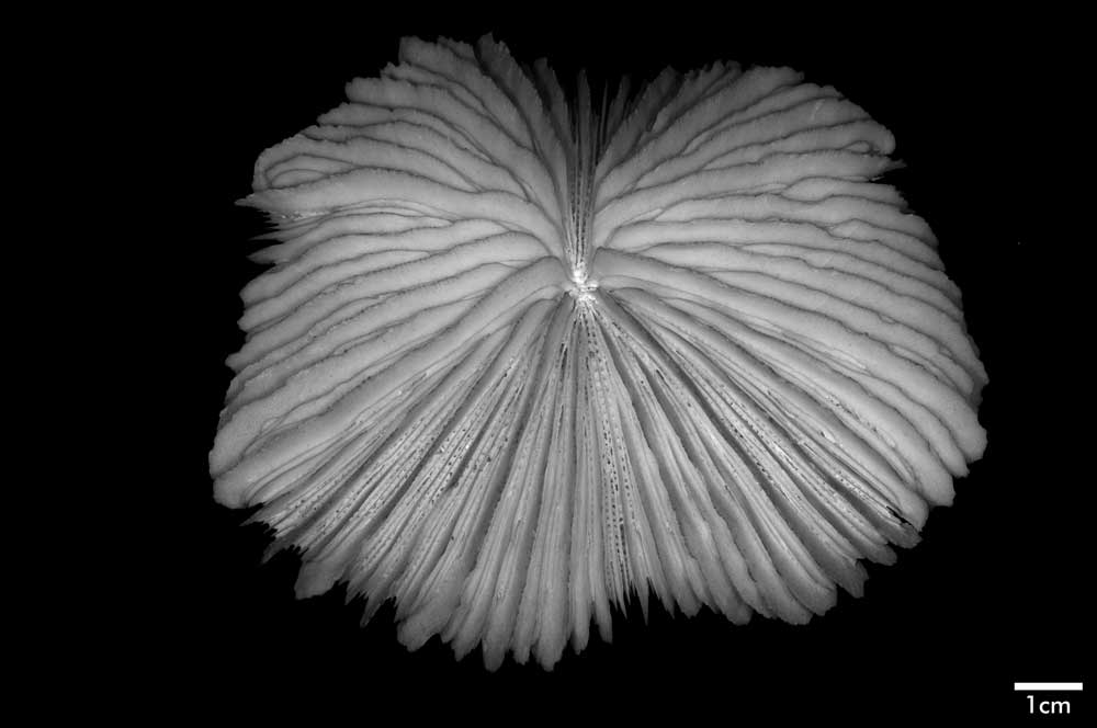 Corallum almost circular, imperforate, large – around 14 cm across; edge distinctly undulate, even plicated, thin – only 1 mm excluding septa. Upper surface low convex, appearing rugged because of very marked difference in height among septa and their lax arrangement so that synapticulae very visible. Lower surface slightly concave; a number of concentric zones – at least four – faintly discernible; its small central portion – 12 mm across – protrudes a little, almost completely free of spines or papillae but uneven surface.