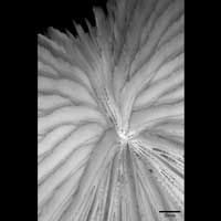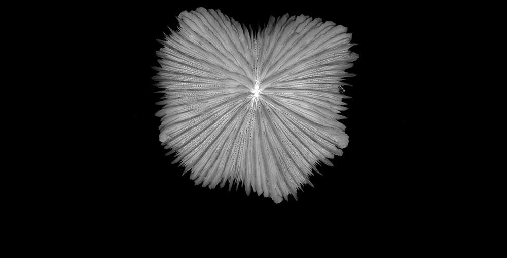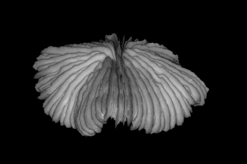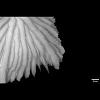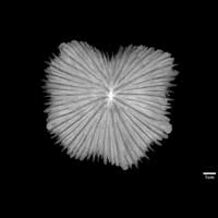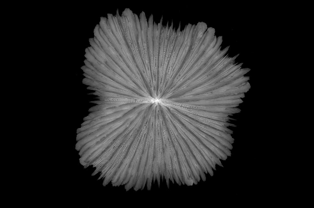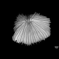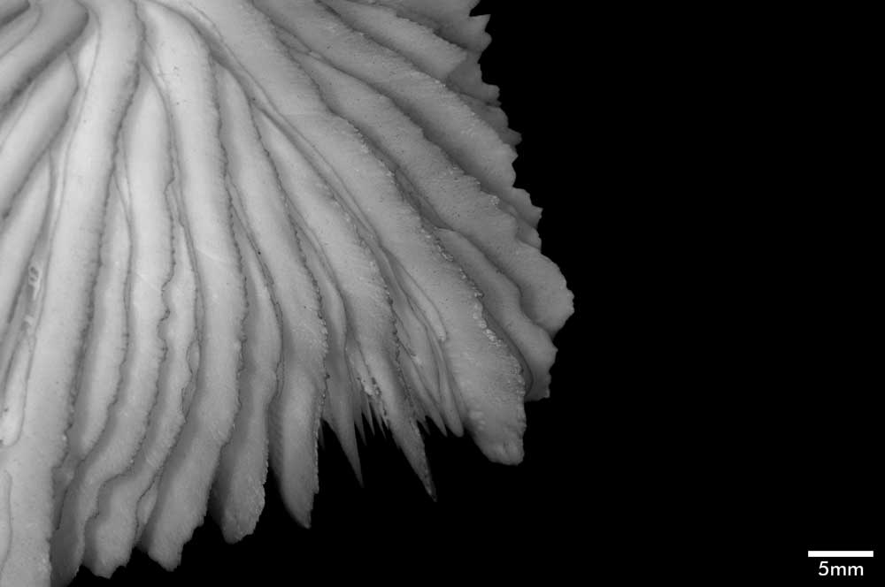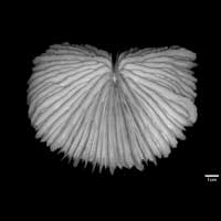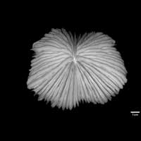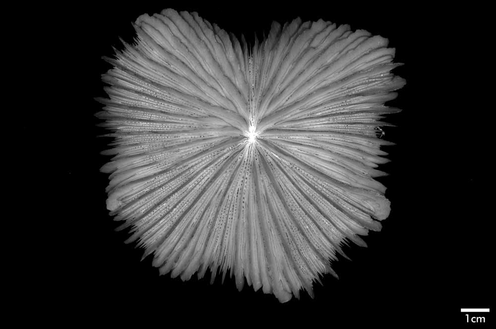 Corallum almost circular, imperforate, large – around 14 cm across; edge distinctly undulate, even plicated, thin – only 1 mm excluding septa. Upper surface low convex, appearing rugged because of very marked difference in height among septa and their lax arrangement so that synapticulae very visible. Lower surface slightly concave; a number of concentric zones – at least four – faintly discernible; its small central portion – 12 mm across – protrudes a little, almost completely free of spines or papillae but uneven surface.