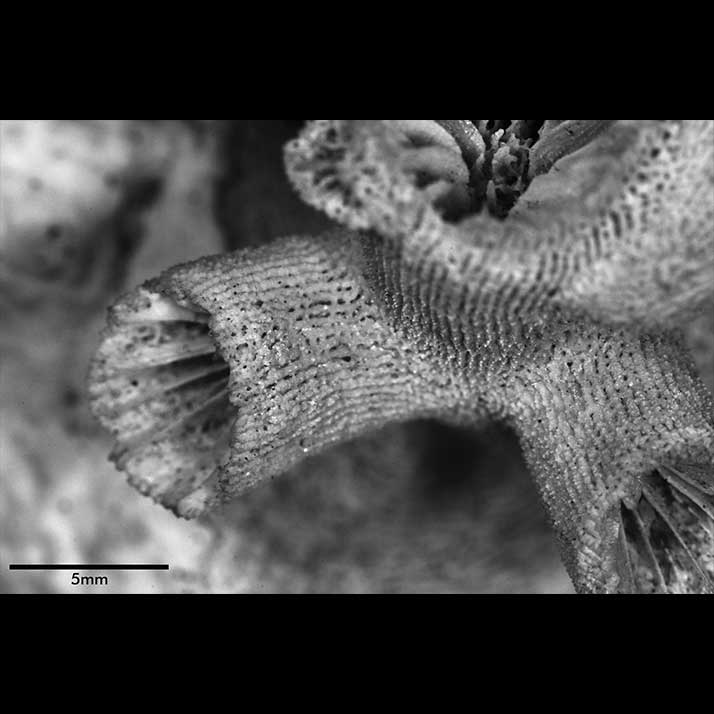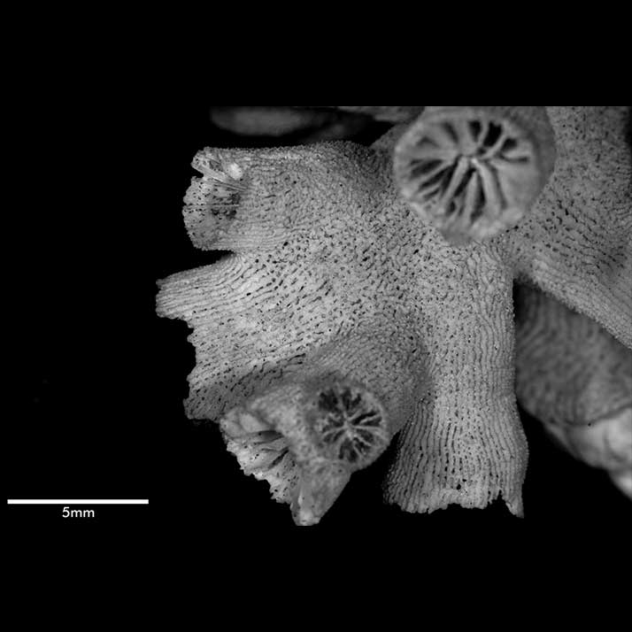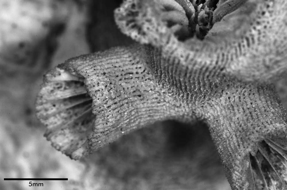 Costal ridges running throughout length of branches but becoming less distinct towards distal ends of corallites, edges armed with low spinules irregularly disposed, not in rows. Intercostal furrows with deep pits, usually narrower than ridges.