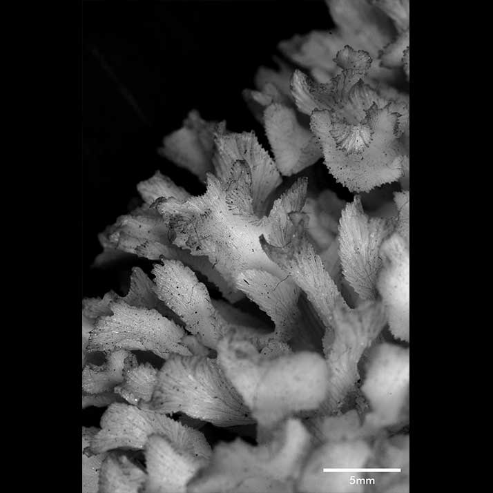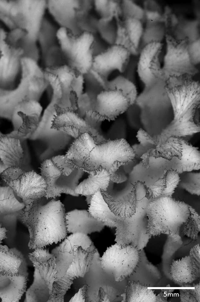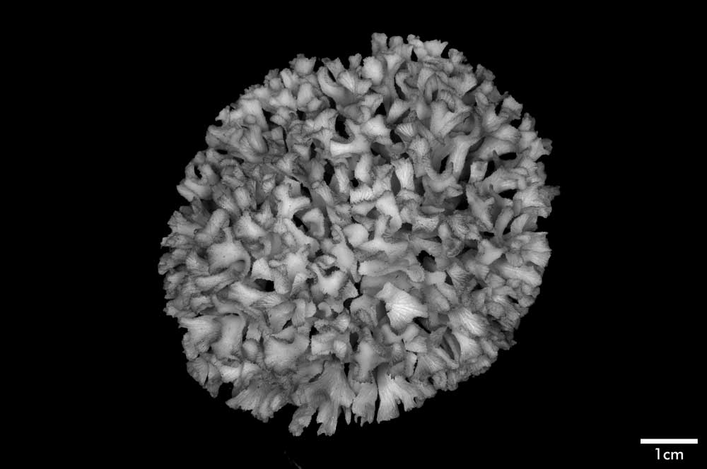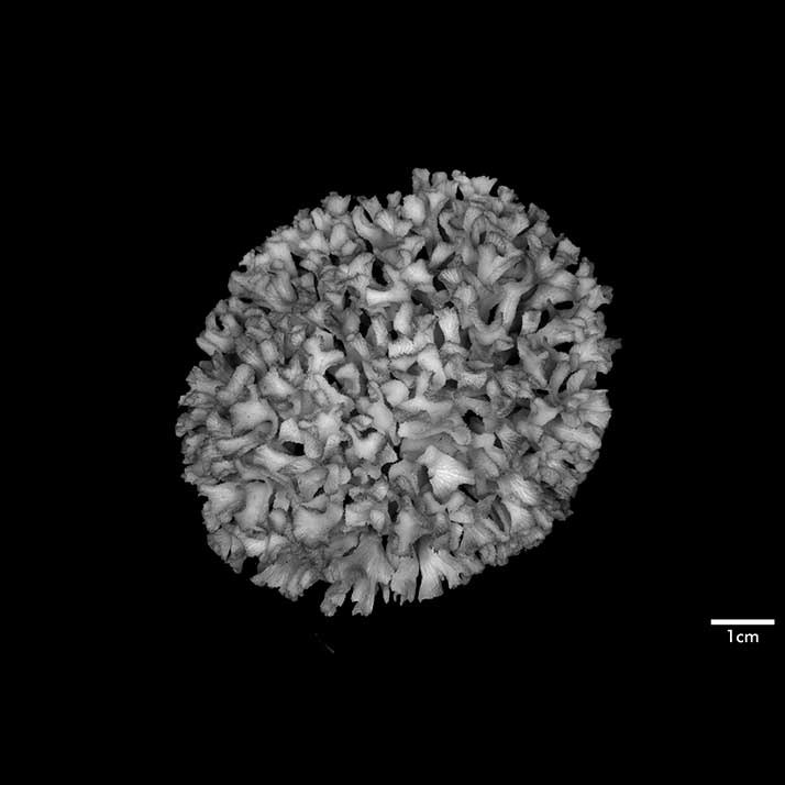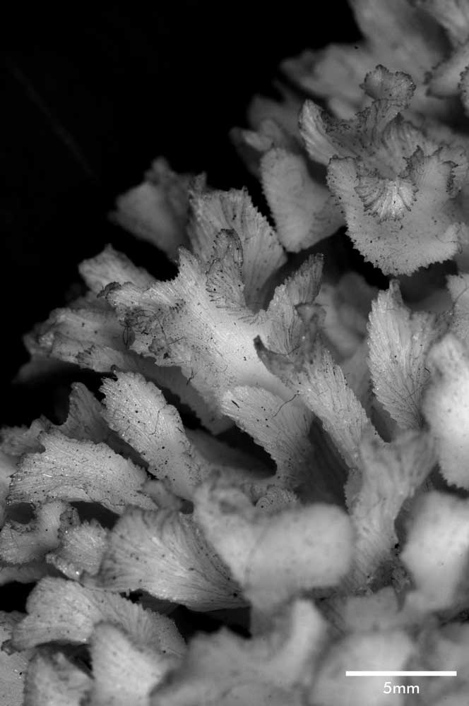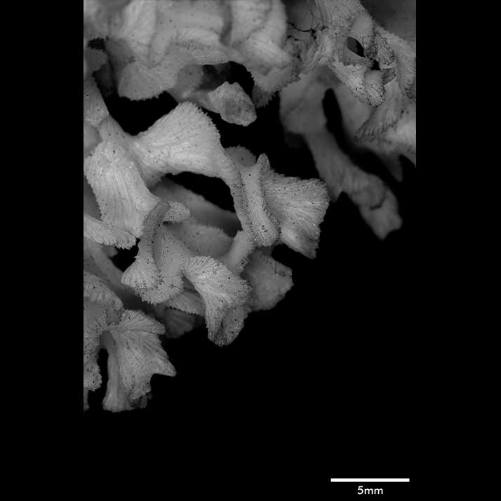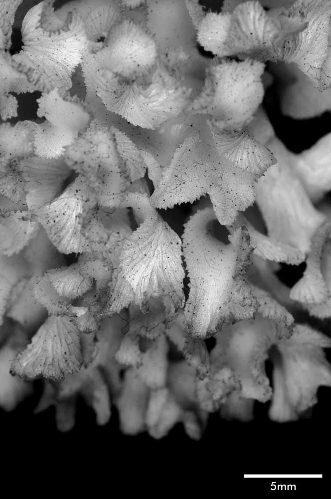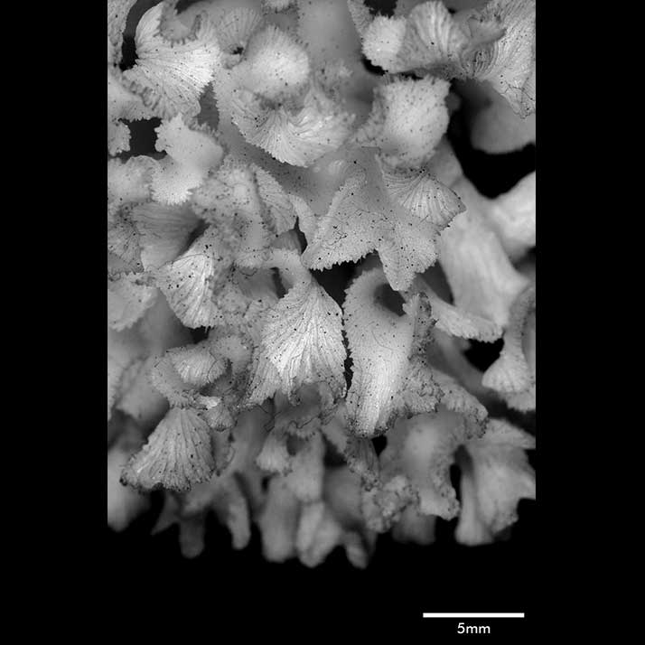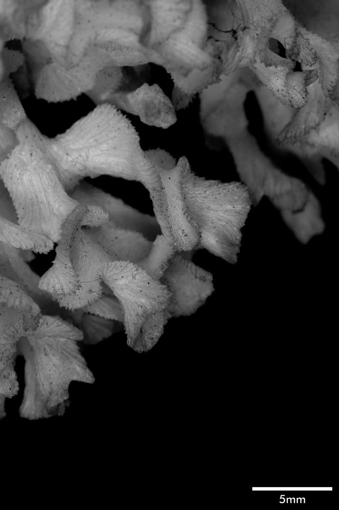Corallum an almost globular, very crowded cluster of foliated branches, 8.6 cm longest diameter, 6.5 cm high. Branches grow towards all directions; delicate, twisted, ramified, crispate, unifacial. General tendency is for a branch and all its subdivisions to curl so that they are convex on calicular side, concave on non calicular surface. Length of branch 3.5 to 4.5 cm. Tips very thin, around 0.5 mm; very fragile, 3-7 mm across, all curled.