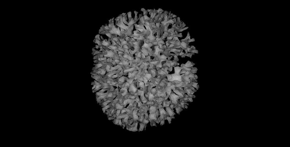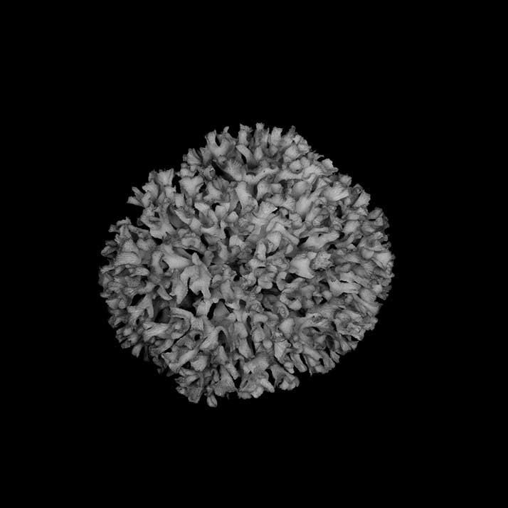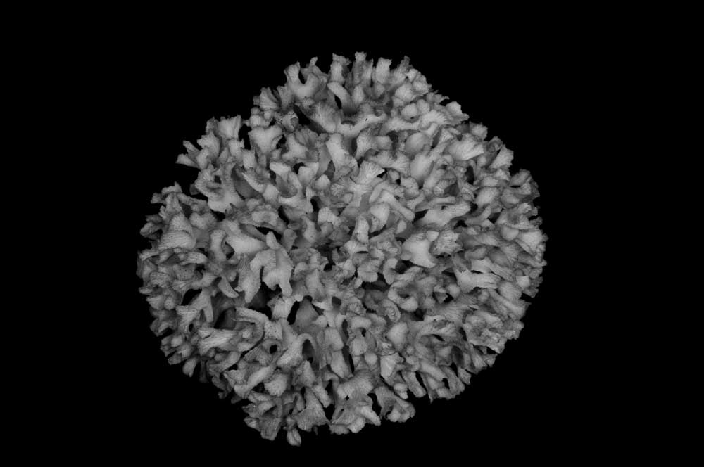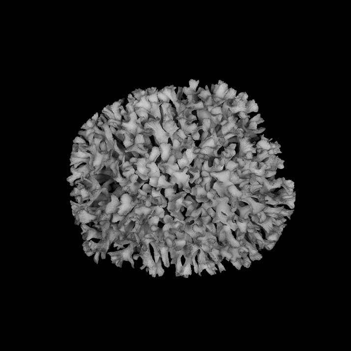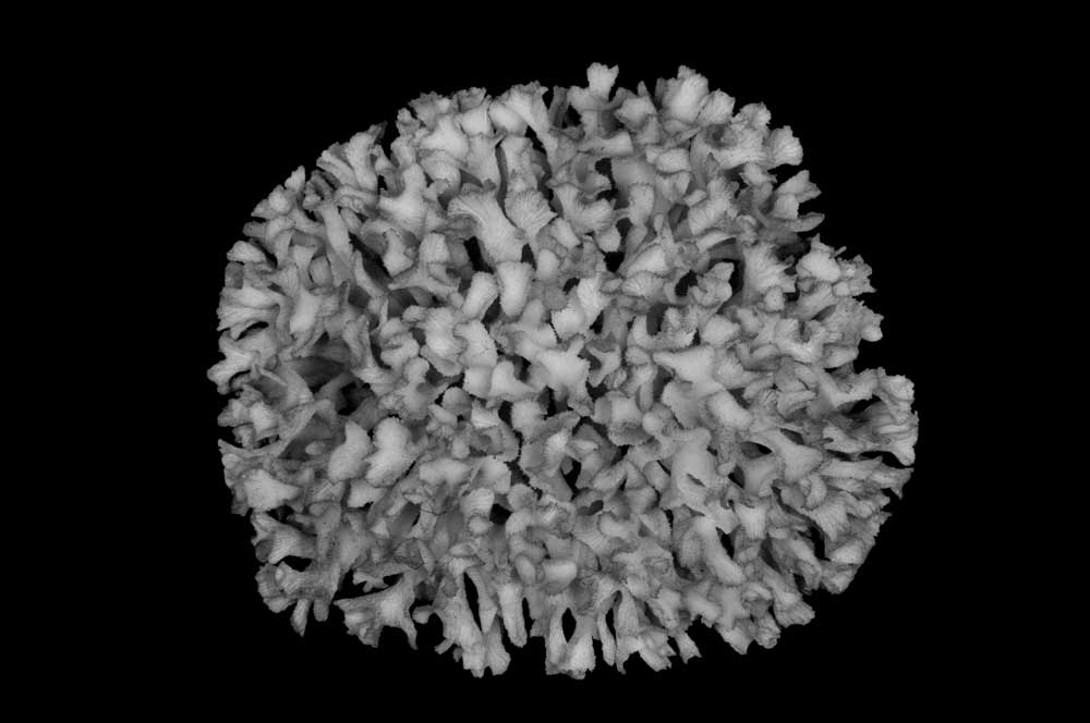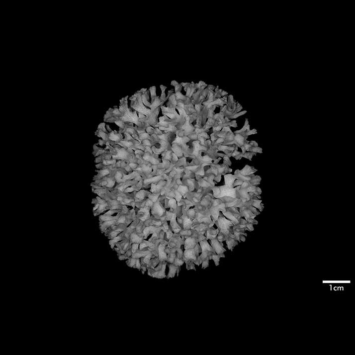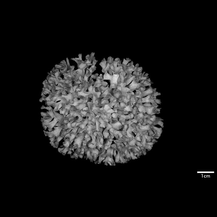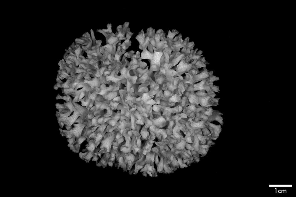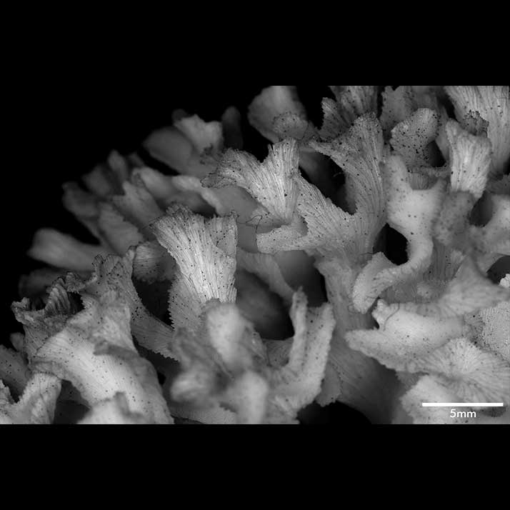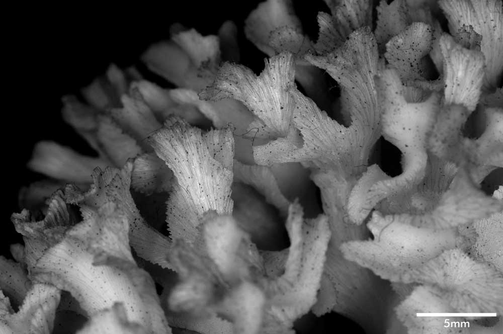 Corallum an almost globular, very crowded cluster of foliated branches, 8.6 cm longest diameter, 6.5 cm high. Branches grow towards all directions; delicate, twisted, ramified, crispate, unifacial. General tendency is for a branch and all its subdivisions to curl so that they are convex on calicular side, concave on non calicular surface. Length of branch 3.5 to 4.5 cm. Tips very thin, around 0.5 mm; very fragile, 3-7 mm across, all curled.