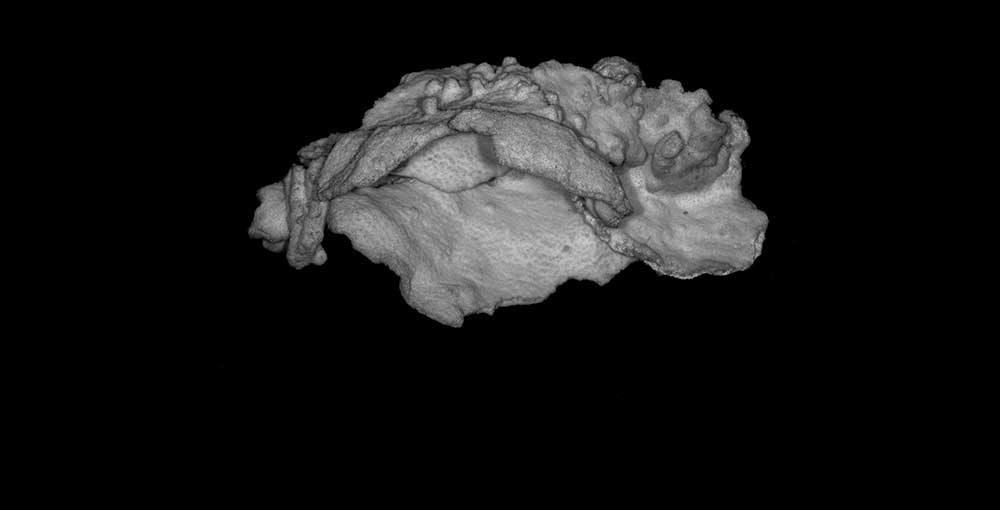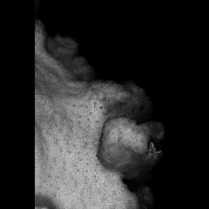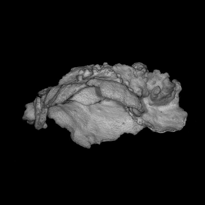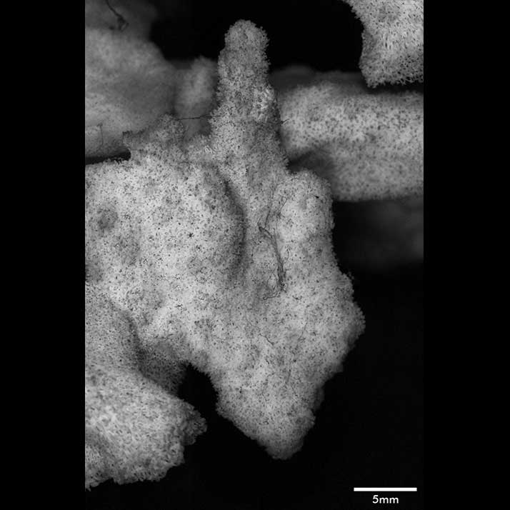 Corallium foliate, explanate. Folia thin, 2.5-3 mm thick at edge, slightly thicker inward; irregular folded but generally concavo-convex, overlapping and coalescing when edges meet. Living portion up to 9-10 cm wide; boundary between living and dead portion marked by narrow epitheca. Under surface of lowest folium strewn with cylindrical projections reaching 1.5 cm at most; projections very few on upper folia and on upper surface.