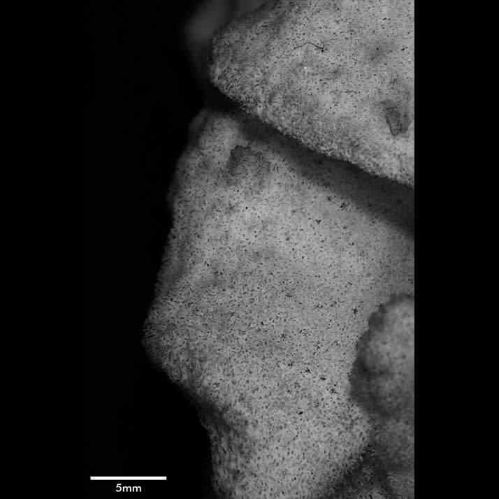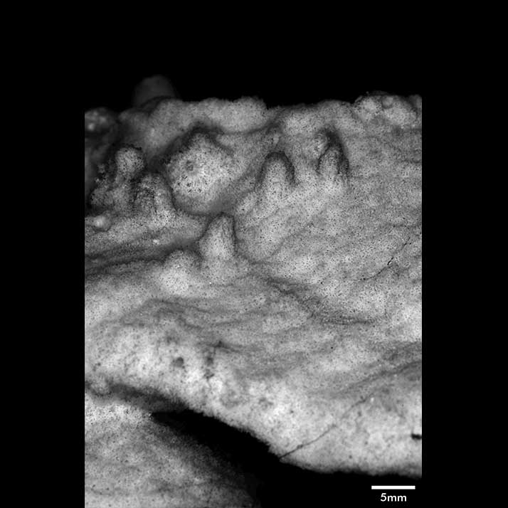 Calicles abundant; average diameter 0.8 mm or less; 1-2 diameters apart. Those within deep depressions flush with surface, conspicuous calices; those on elevated surface usually slightly protruding, less conspicuous calices; in some areas, the latter are arranged in wavy rows of varying length. Not much difference discernible between calicles on both sides.